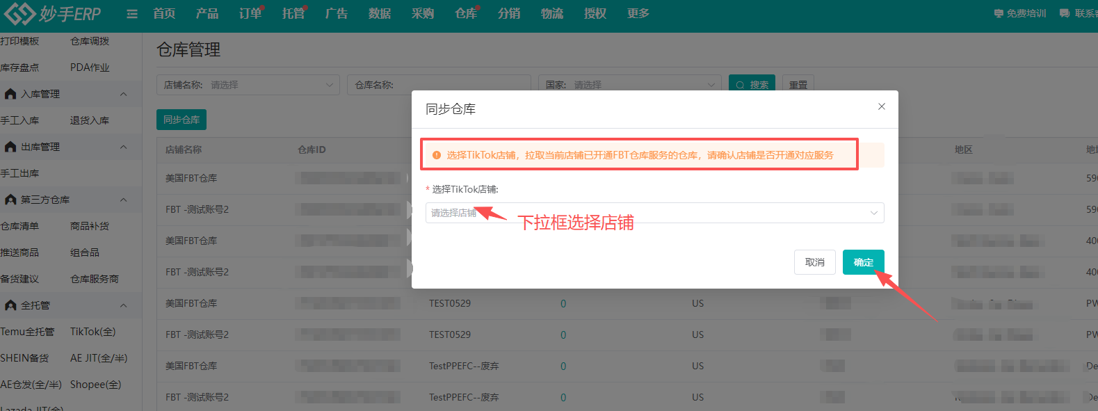 (2)功能界面中,直接点击【同步仓库】,并在弹窗中选择已开通FBT仓库服务的仓库,点击【确定】