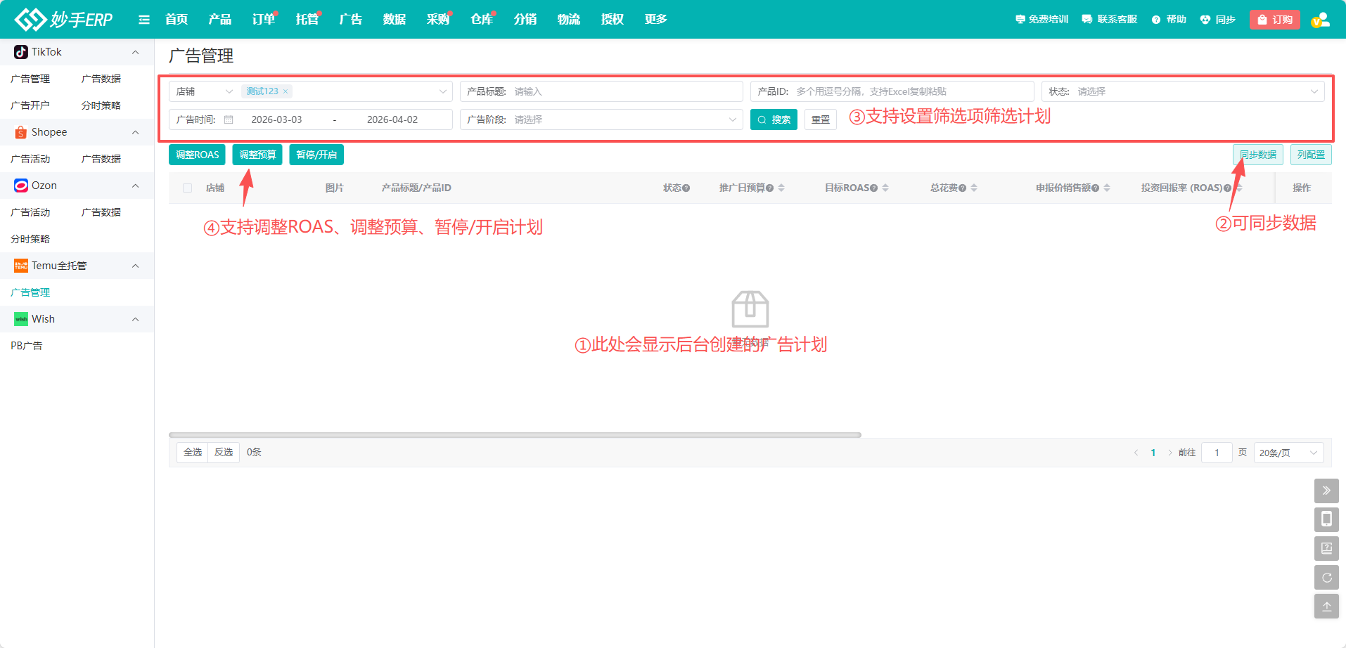 数据同步到妙手ERP之后,支持筛选广告计划,调整ROAS、预算以及开启和暂停计划