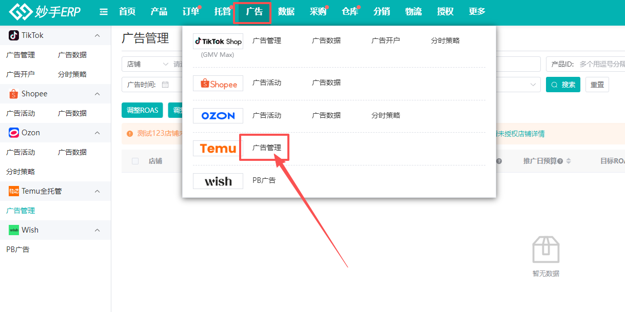 1、进入妙手ERP=>广告=>Temu=>广告管理