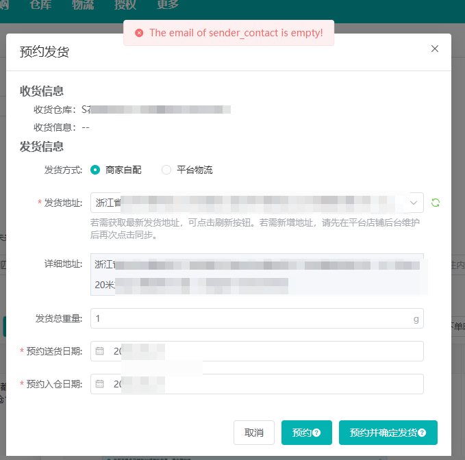 Tiktok全托管发货方式选择商家自配提示“The email of sender contact is empty!”后台没有可以设置邮箱的,需要如何处理?