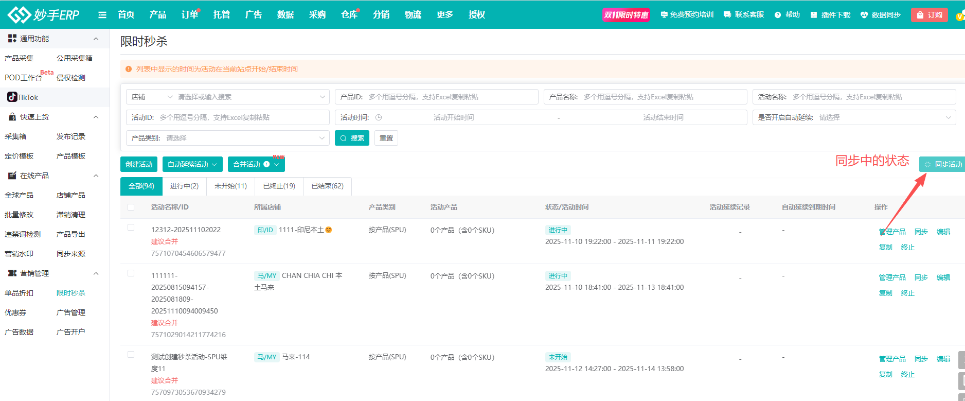 (1)进入妙手ERP,点击产品=>限时秒杀