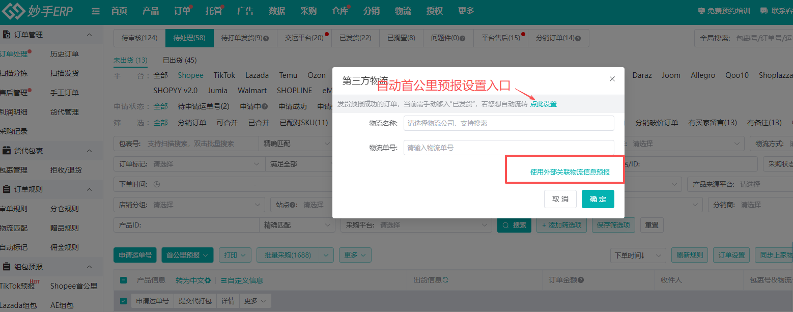 当使用代发采购的订单发货后,手动在第三方物流中点击【使用外部关联物流信息预报】