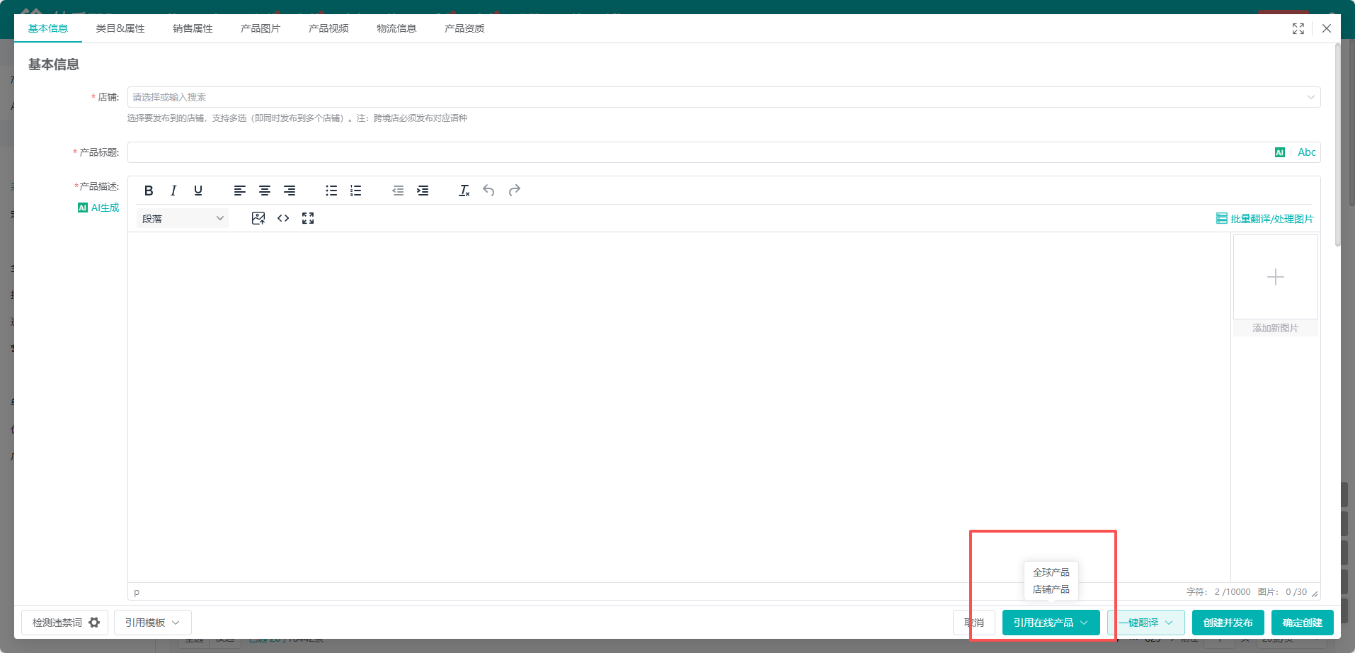 (4)使用界面右下方“引用在线产品”功能,在弹窗中可选中店铺的在线产品,系统会将商品信息自动填入对应选项。