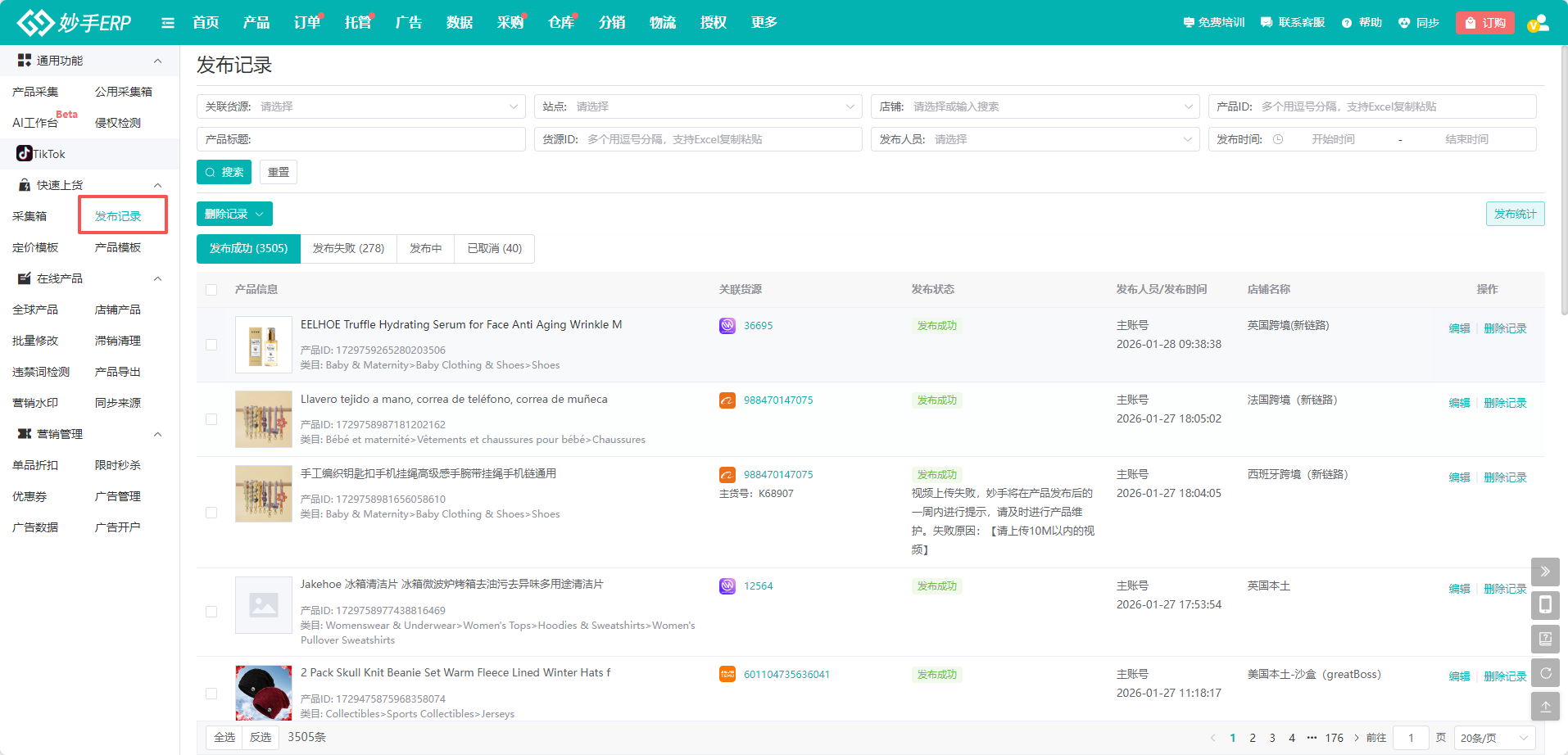 2、跨境店、本土店手动创建产品并发布大致流程为:在平台采集箱中,根据平台规则,将产品信息完整上传后,再发布到店铺=>最后到发布记录中查看产品是否发布成功