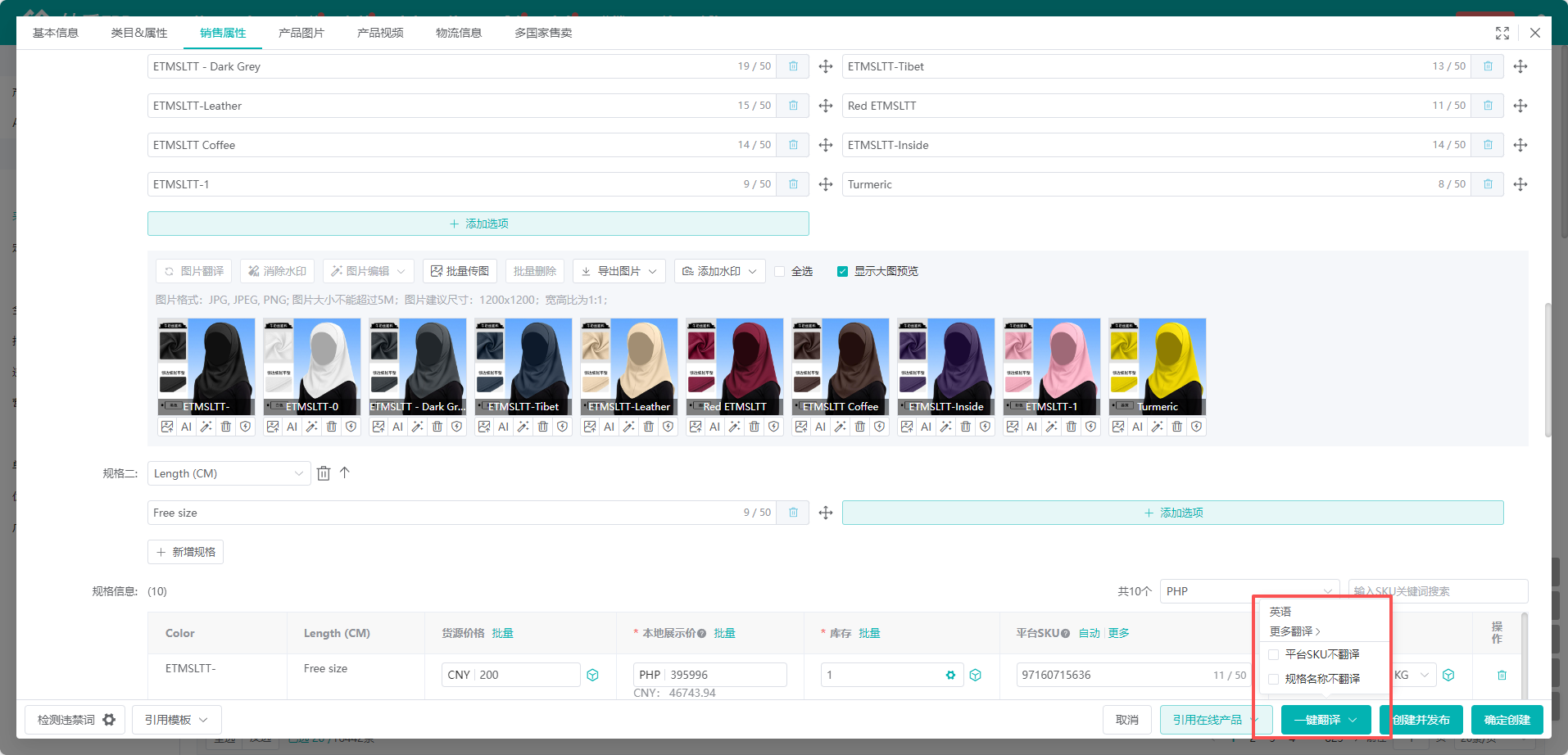 (6)支持翻译功能,在右下角位置点击【一键翻译】,将文字翻译成需要的语言,目前支持勾选平台SKU、规格名称不翻译,满足不同使用场景
