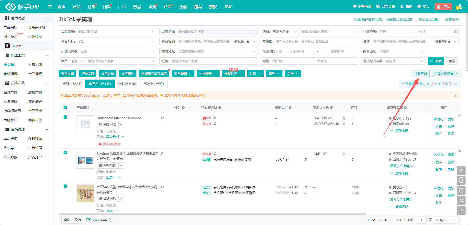 (1)进入妙手ERP,选择产品=>TikTok采集箱