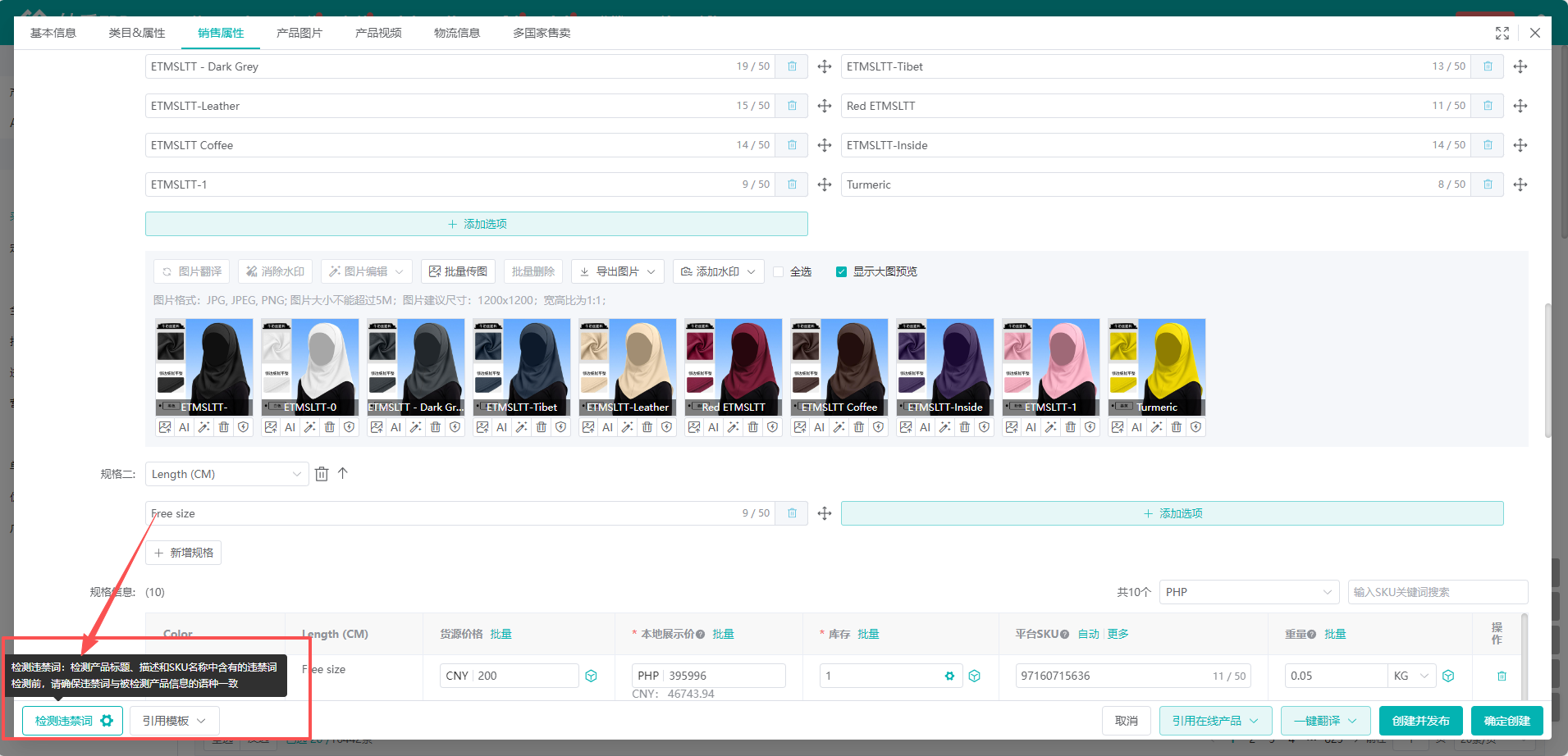 (5)点击界面右下方【检测违禁词】功能,妙手ERP会自动检测产品标题、描述和SKU名称中是否含有的违禁词