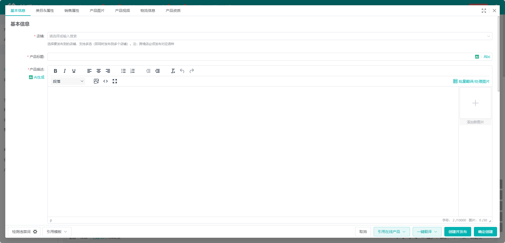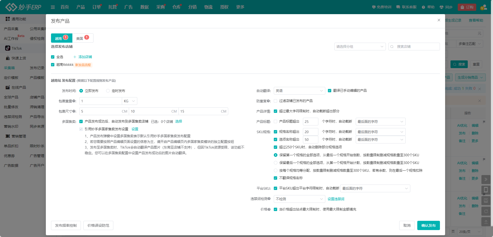 选择【创建并发布】,则会创建产品到采集箱,并弹出【发布产品】弹窗,可在弹窗中操作发布到店铺