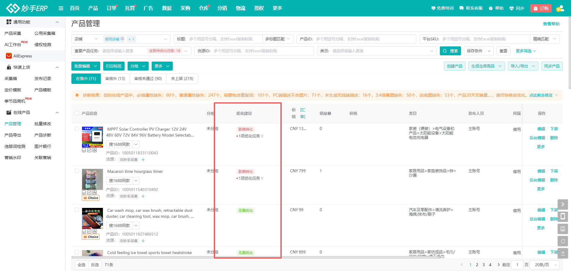 (5) 在售中的产品,系统会根据产品情况显示优化建议,可在产品列表中查看