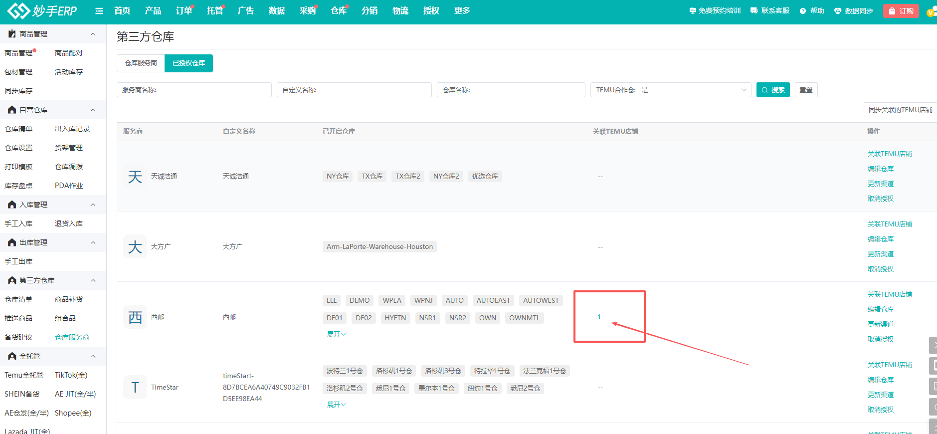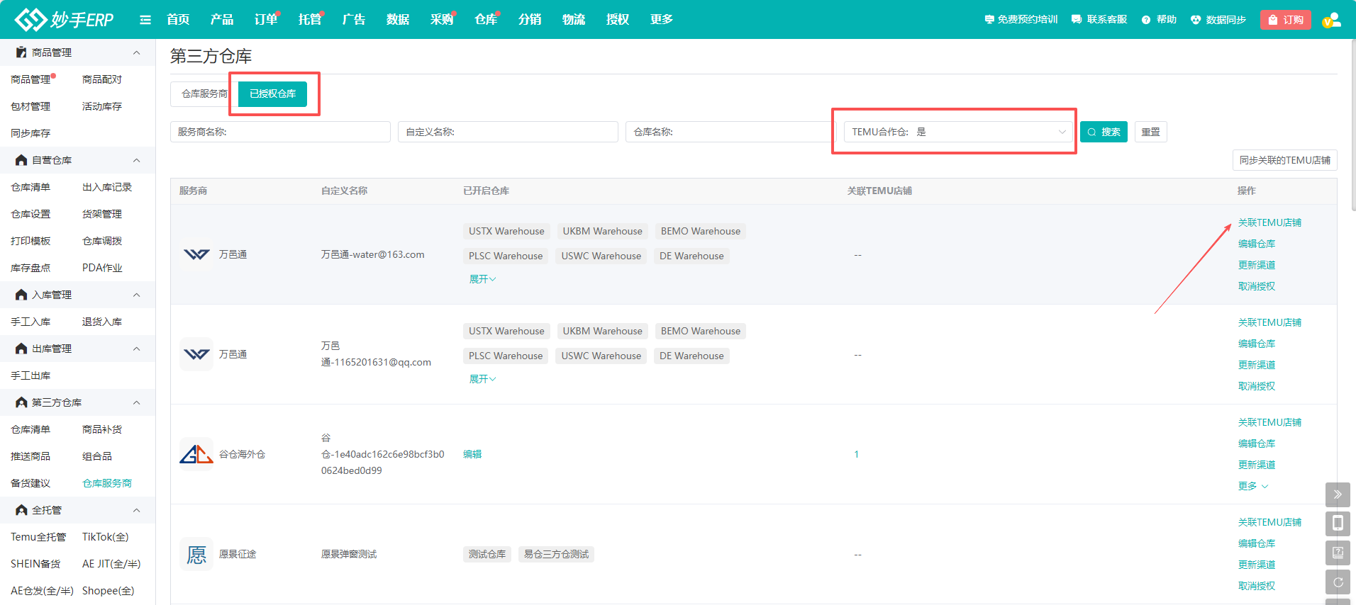 (1)进入妙手ERP=>仓库=>仓库服务商,在仓库列表中找到海外仓授权,授权流程可跳转查看:海外仓授权合集