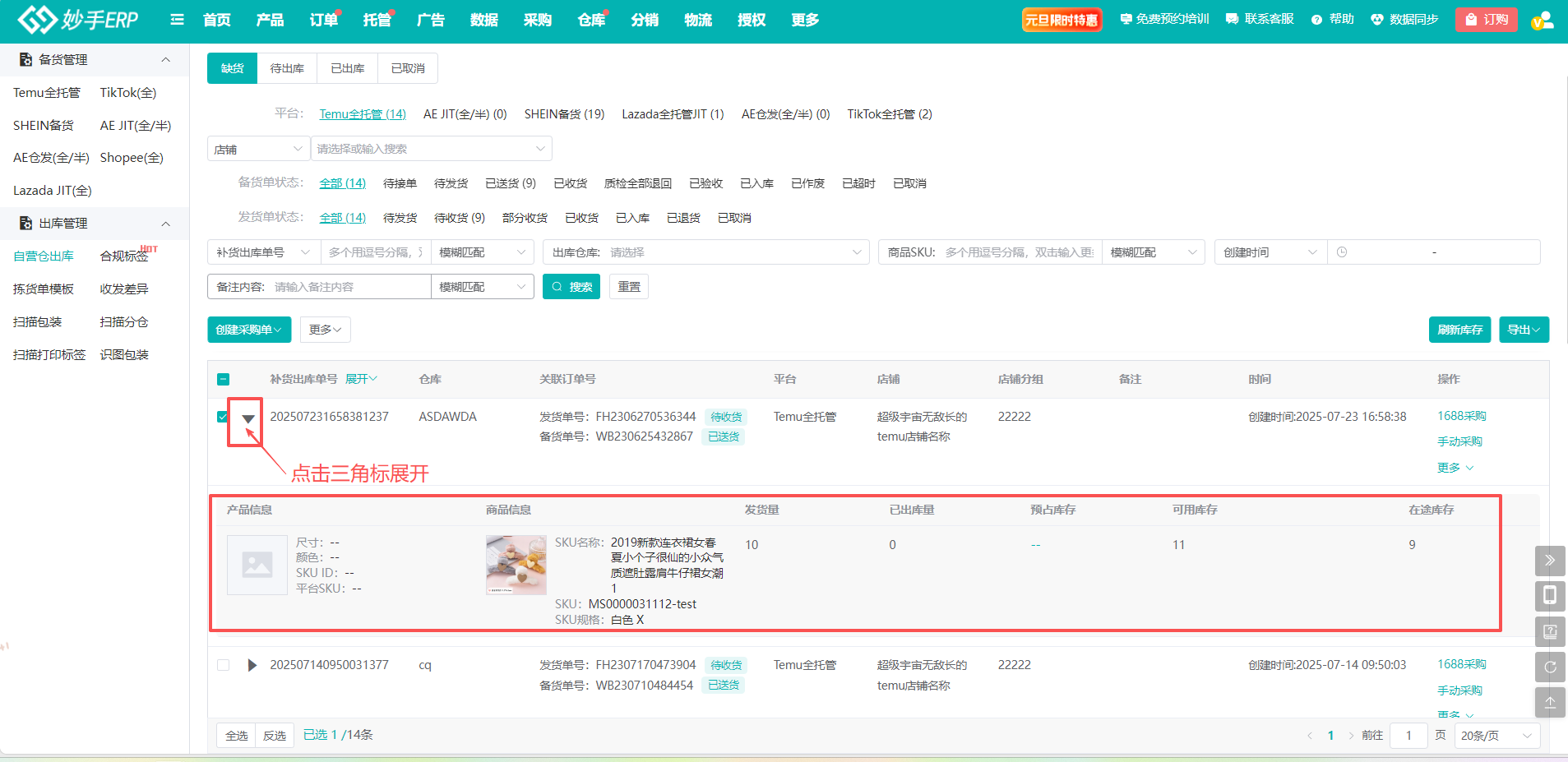 (7)点击订单下拉框,可查看具体的产品信息,以及目前所需发货量、库存量