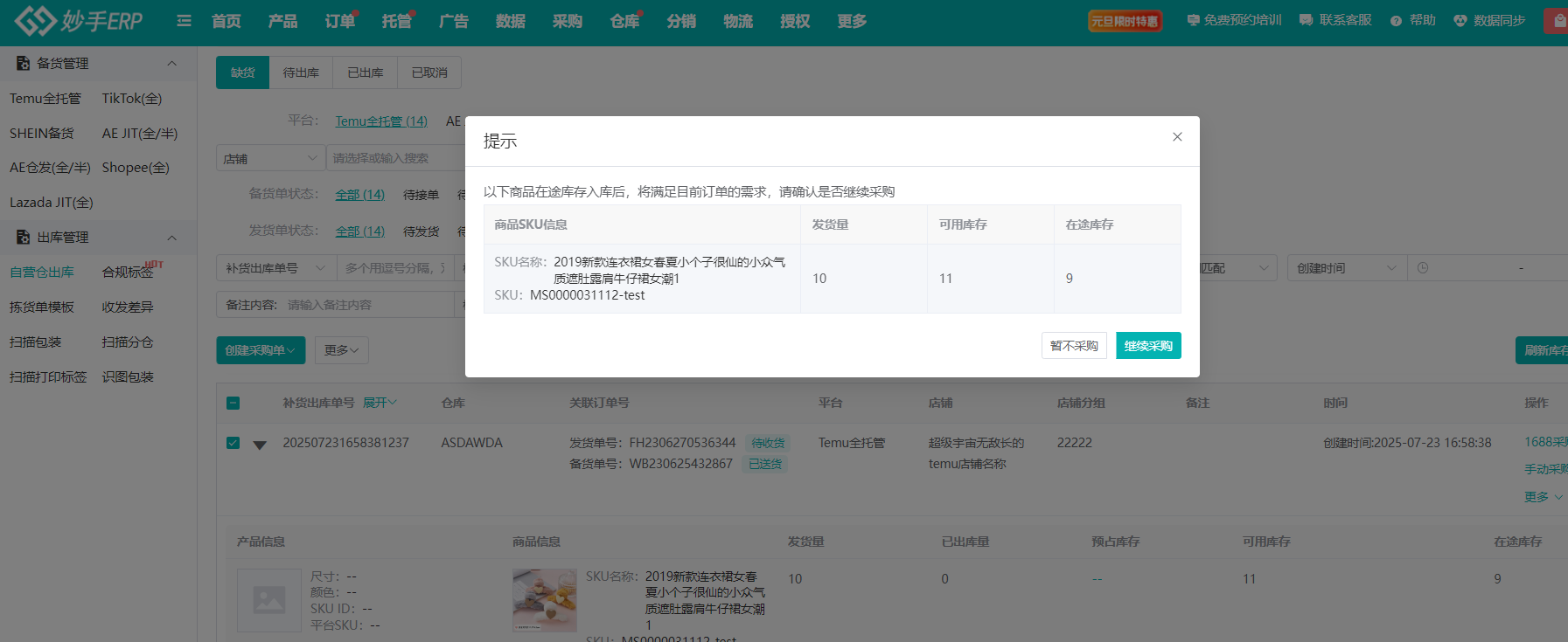 创建采购单之前,如果系统检测到目前在途库存入库后,即可满足订单所需商品数量时,会出现以下提示,用户根据实际情况选择是否要继续采购