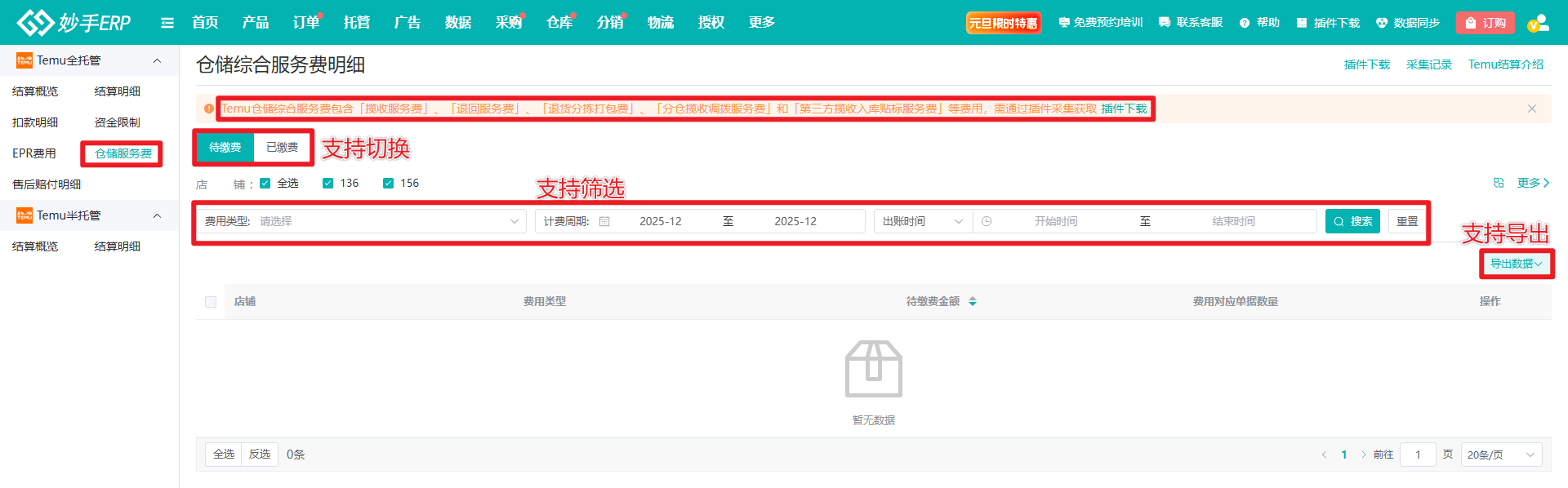 (1)数据采集完成后,进入妙手ERP=>托管=>数据报表=>Temu全托管=>结算概览=>仓储服务费,可查看对应数据