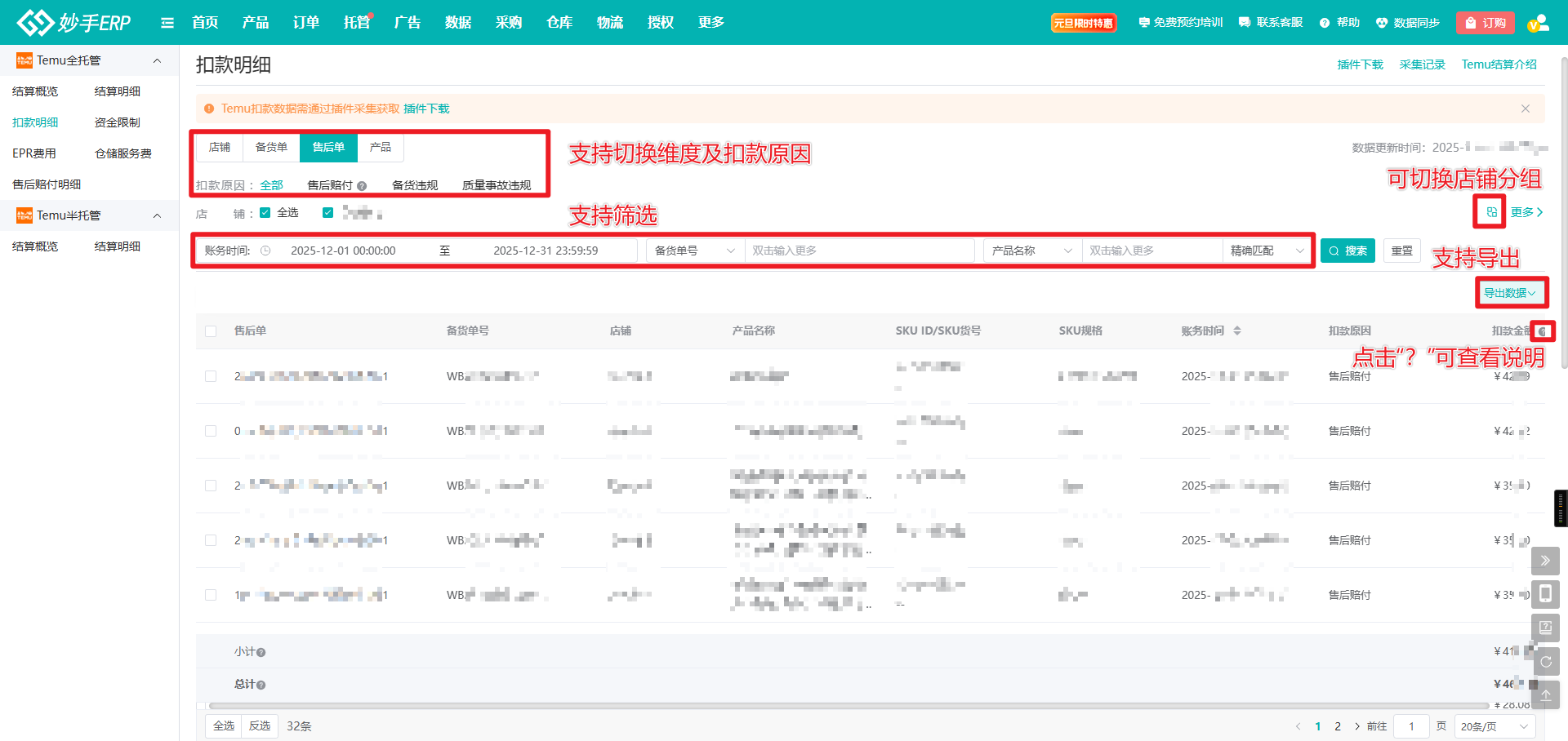 (1)数据采集完成后,进入妙手ERP=>托管=>数据报表=>Temu全托管=>结算概览=>扣款明细,可查看对应数据
