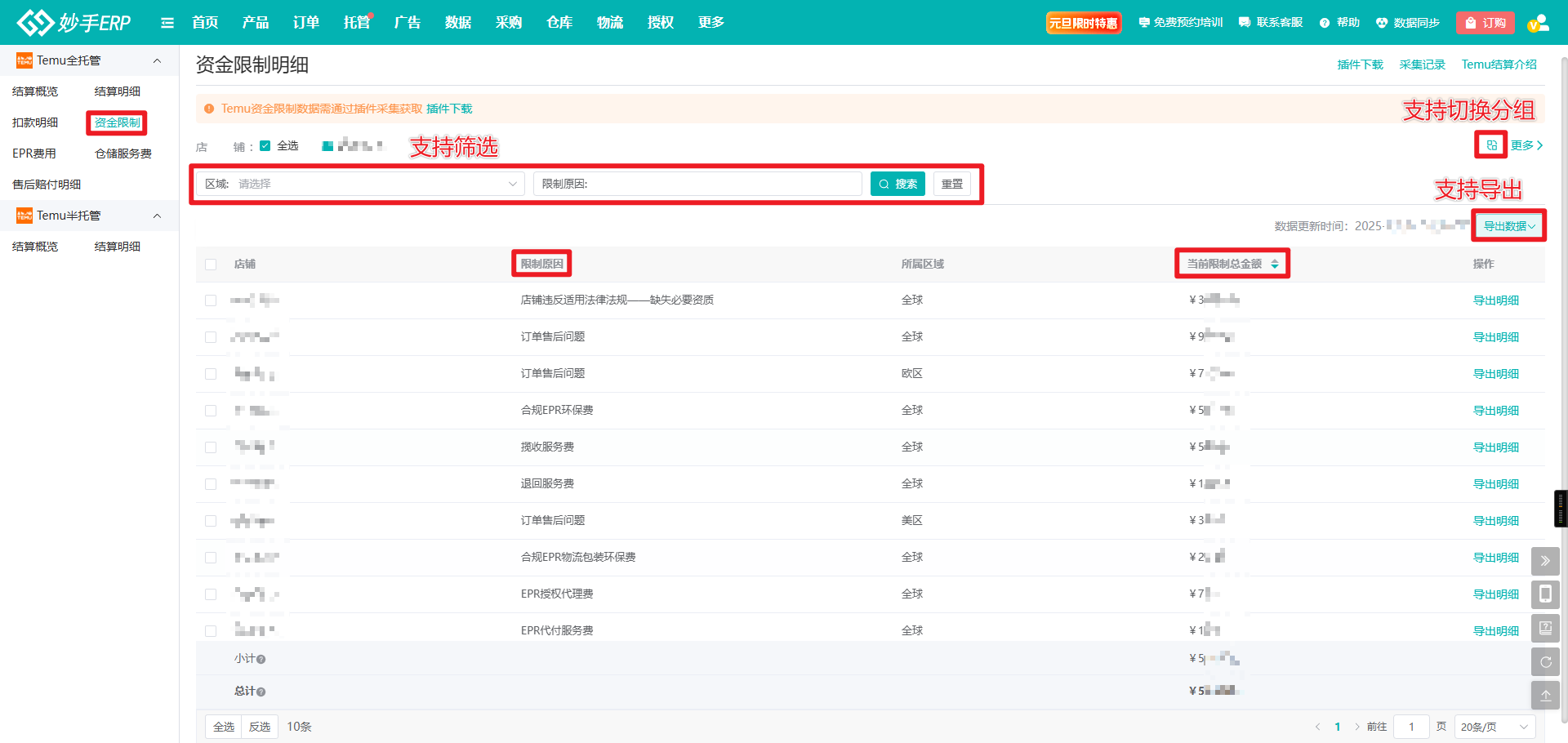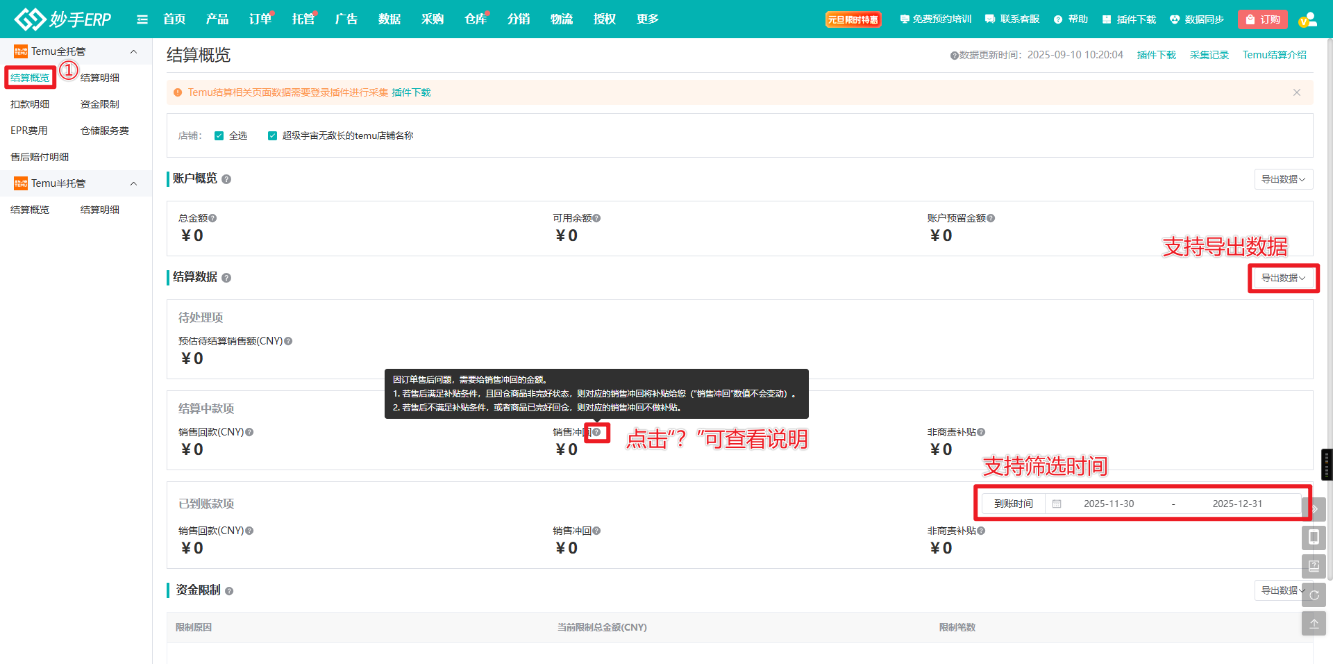 (1)数据采集完成后,进入妙手ERP=>托管=>数据报表=>Temu全托管=>结算概览=>资金限制,可查看对应数据