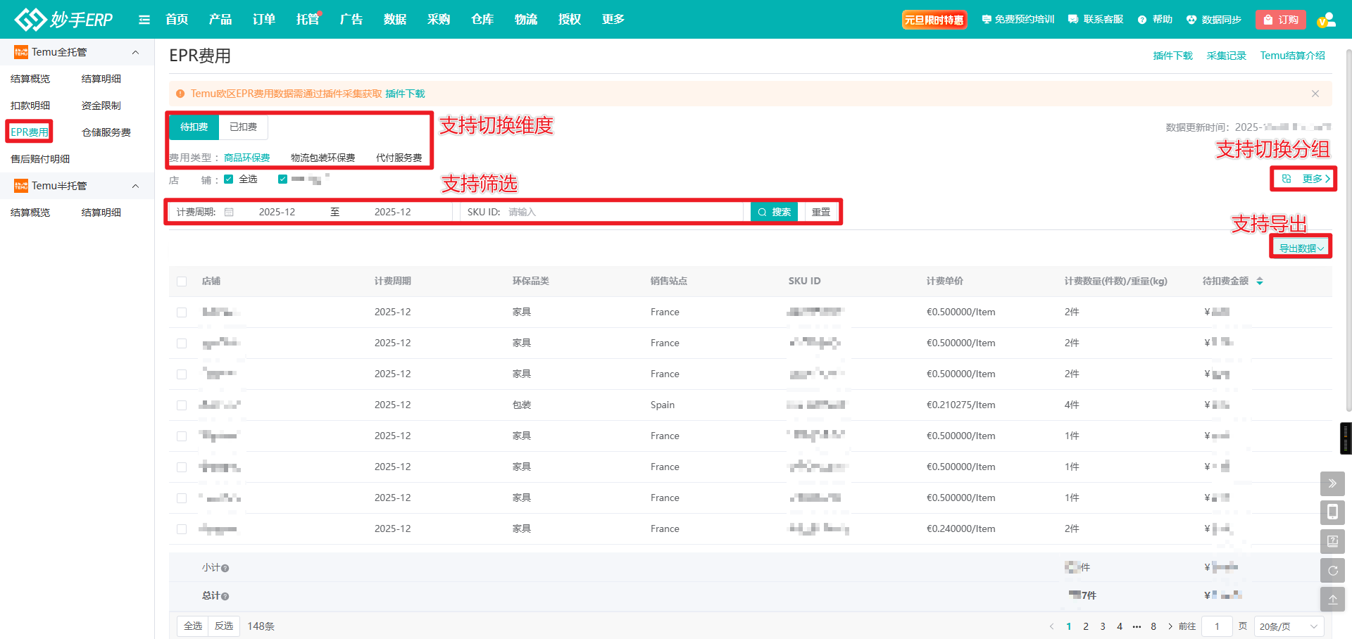 (1)数据采集完成后,进入妙手ERP=>托管=>数据报表=>Temu全托管=>结算概览=>EPR费用,可查看对应数据