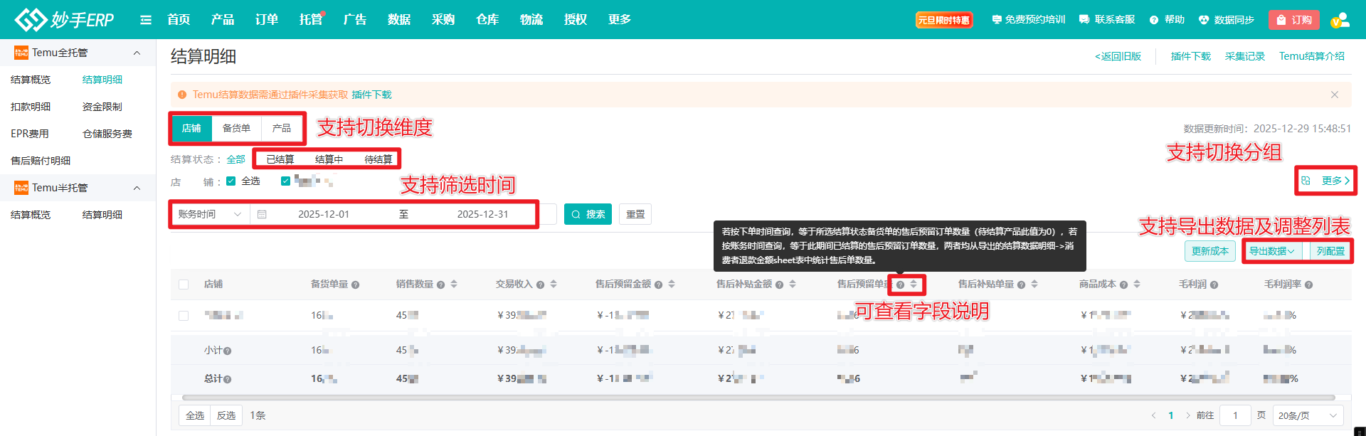 (1)数据采集完成后,进入妙手ERP=>托管=>数据报表=>Temu全托管=>结算概览=>结算明细