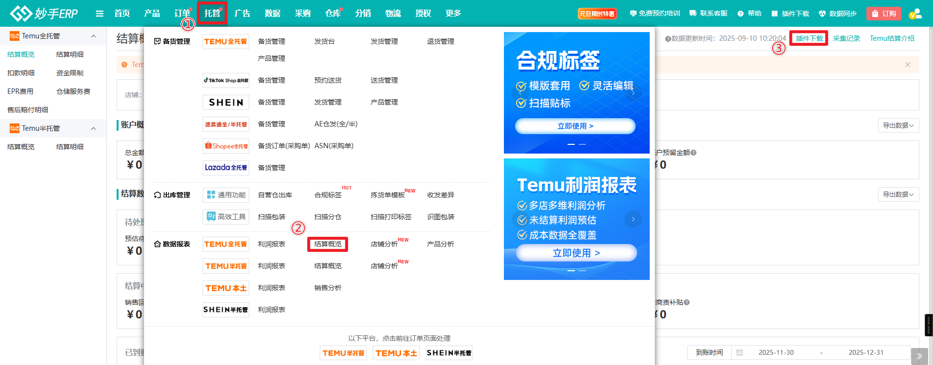 (1)进入妙手ERP=>托管=>Temu全托管=>平台结算,点击右上角的【插件下载】安装妙手插件,具体的插件安装流程可查看:妙手插件下载及安装教程