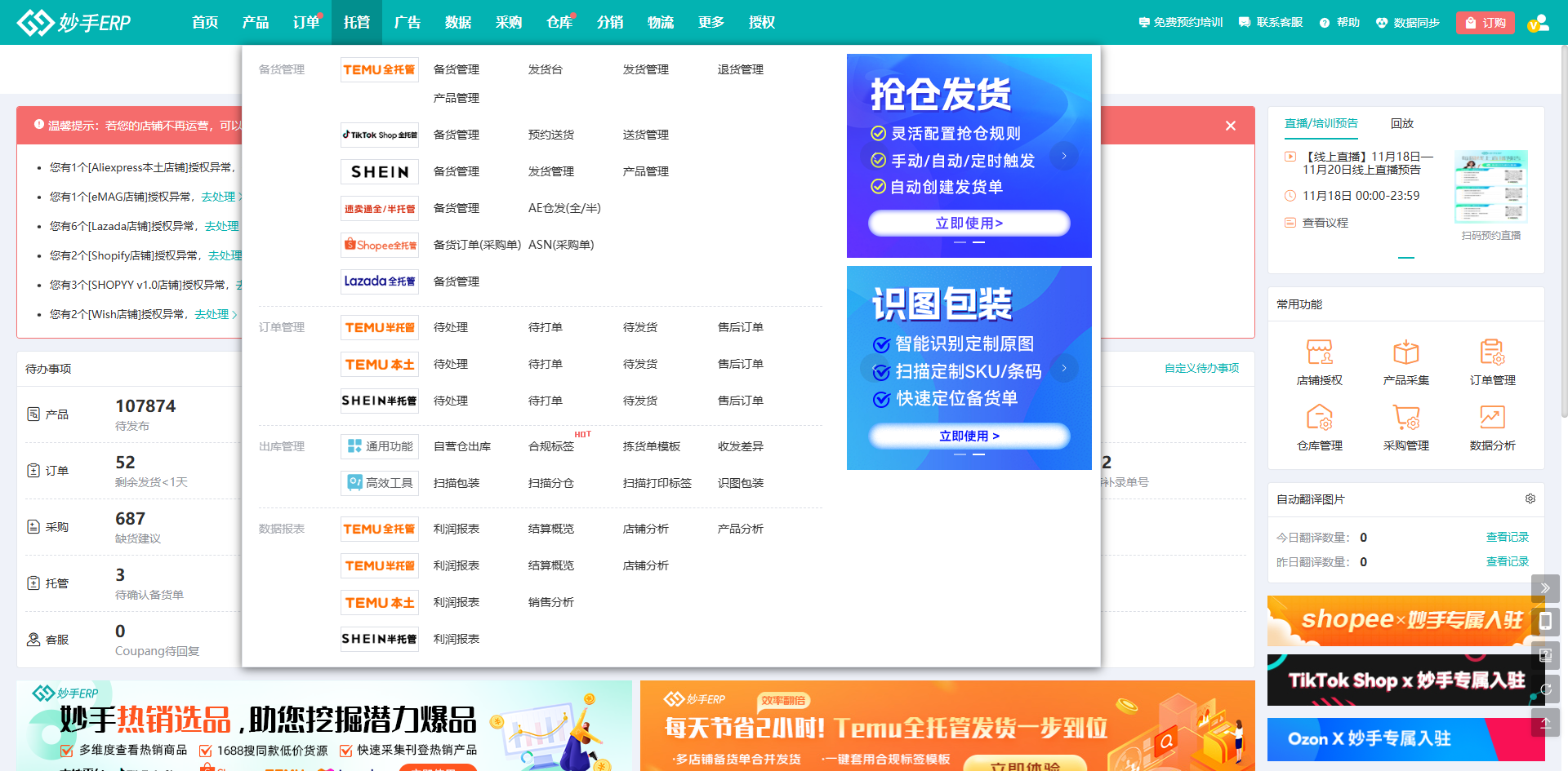 目前妙手支持全托的跨境电商平台有:Temu(特姆)、Lazada、Shein希音、AE