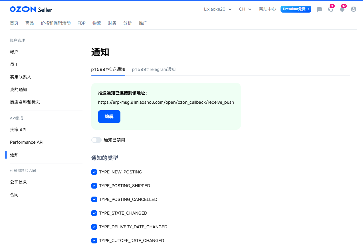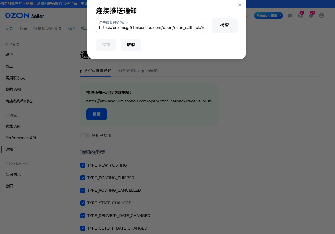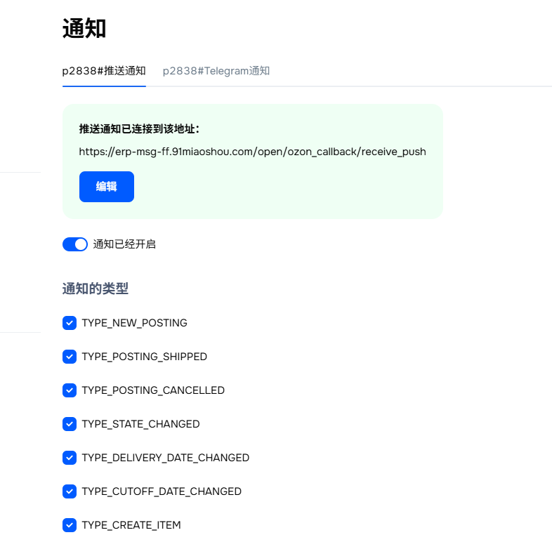 5、最后一步是开启通知功能并勾选所有可用的通知类型。完成这些配置后,Ozon平台就能将订单状态变更等消息实时推送到ERP系统,从而显著提升订单同步的及时性和面单打印的处理速度,为卖家节省宝贵的操作时间。