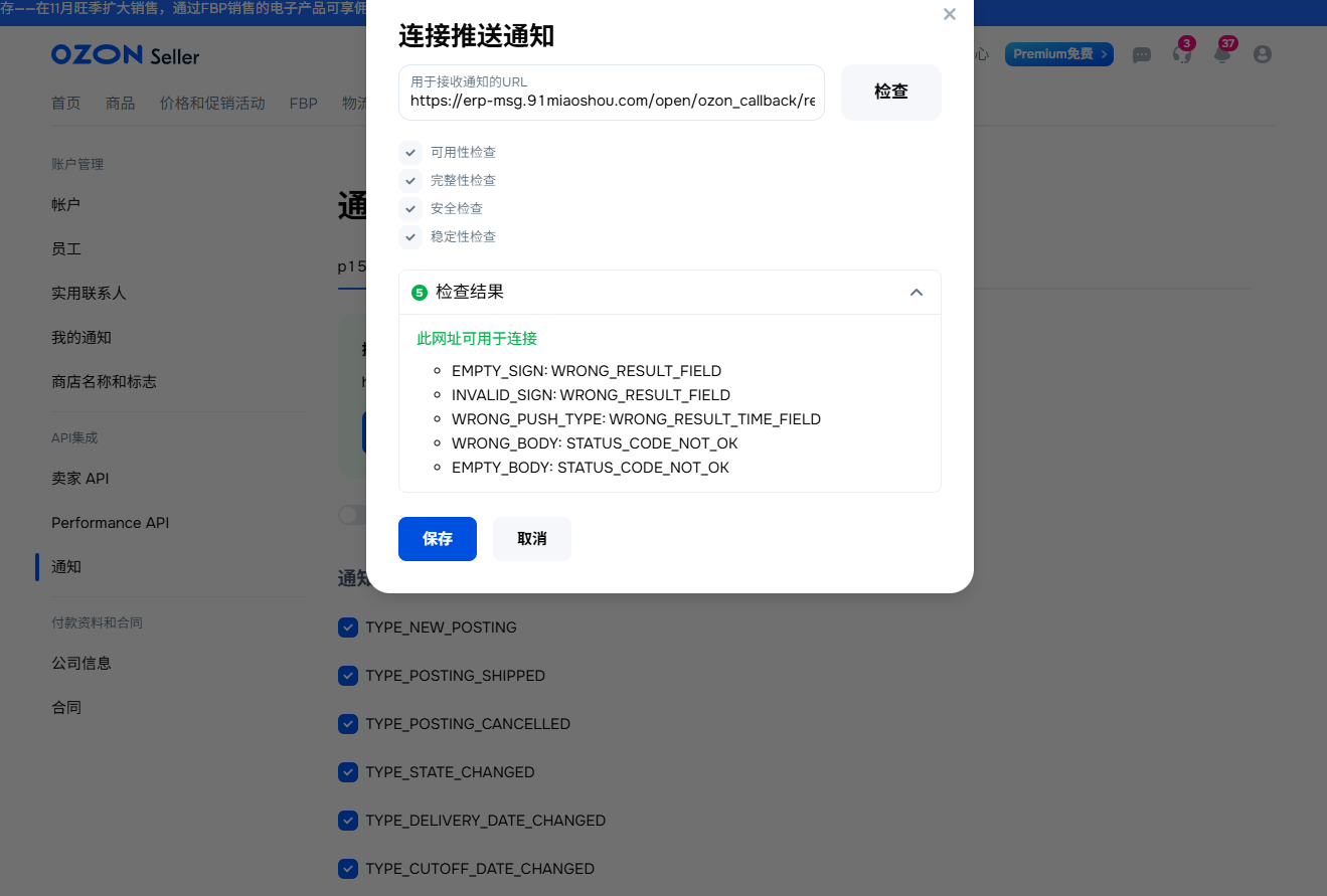 https://erp-msg.91miaoshou.com/open/ozon_callback/receive_push,完成链接地址的输入后,务必点击"检查"按钮验证链接的有效性。