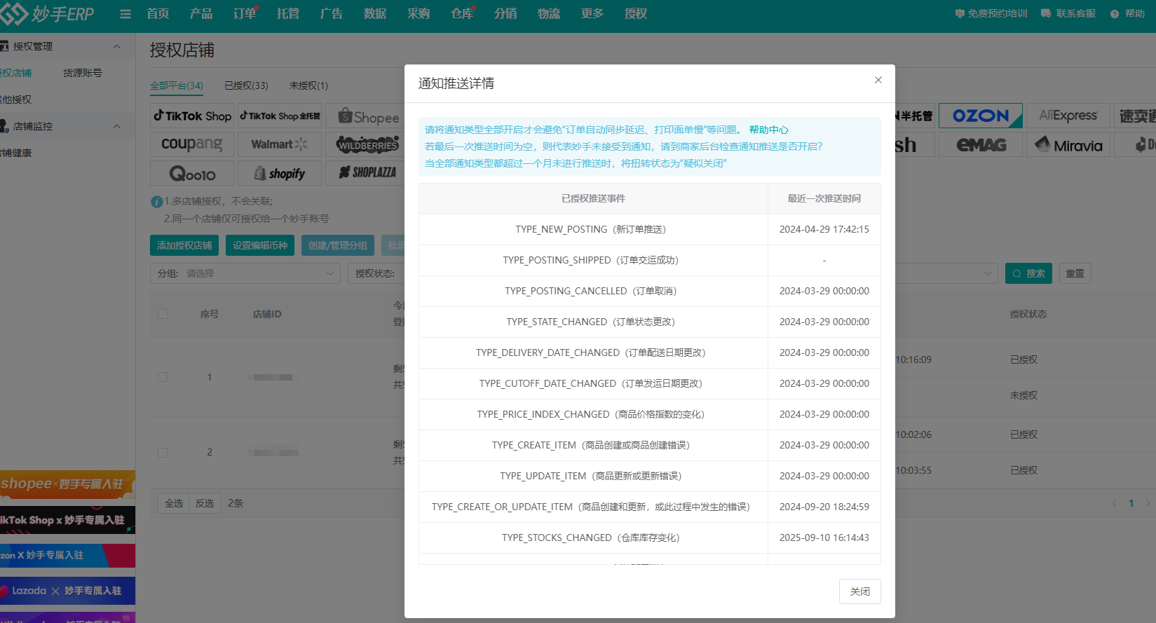 若最后一次推送时间为空,则代表妙手未接受到通知,请到商家后台检查通知推送是否开启?