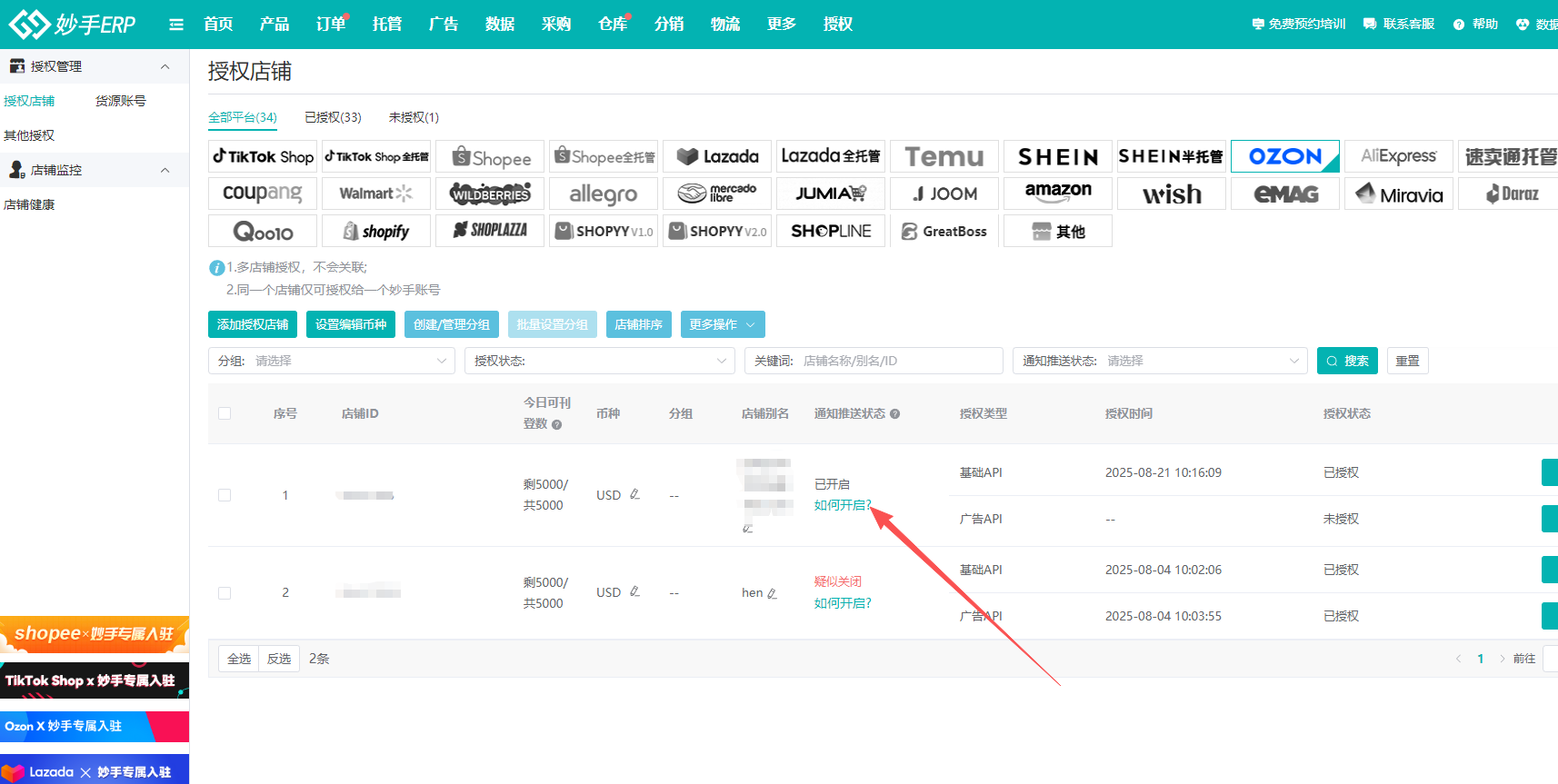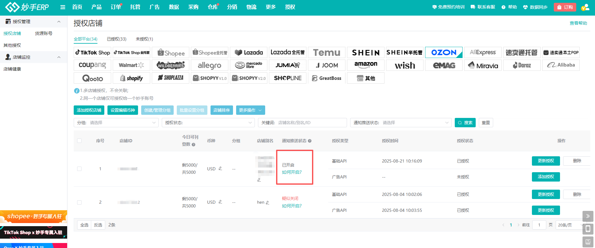 6、完成开启通知后,妙手系统不会立刻更新状态,需要在下次收到通知后更新为:已开启