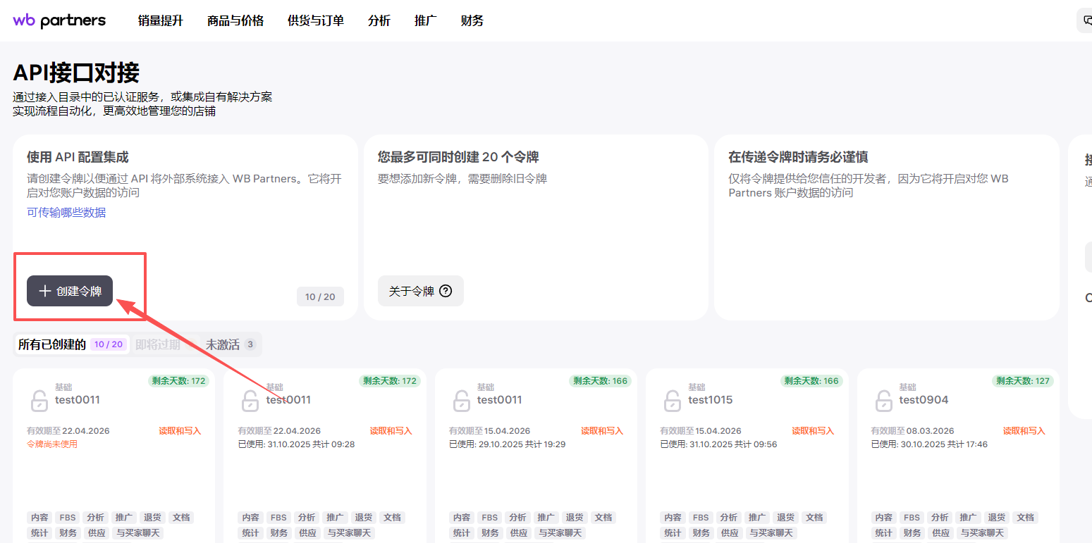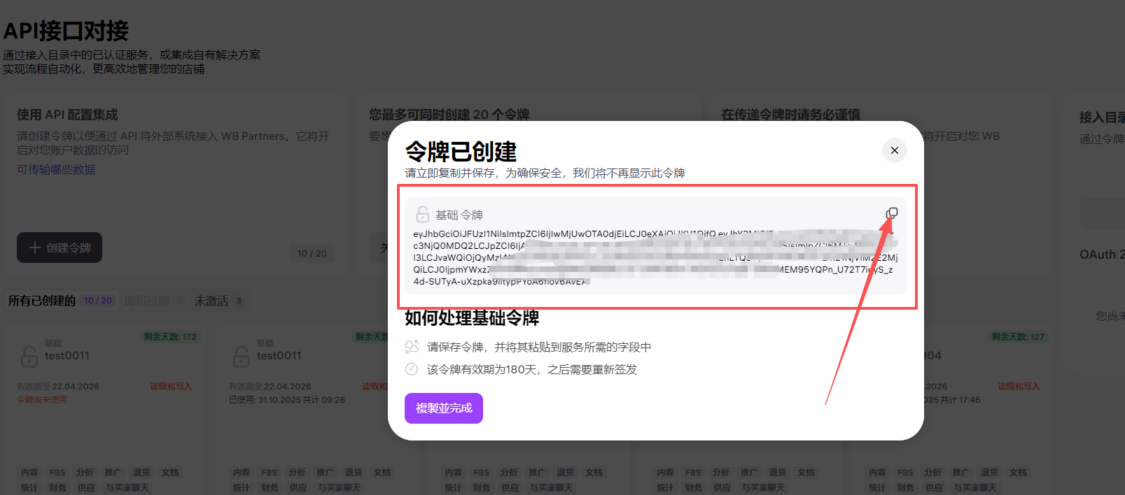 5、创建后会生成Token,点击下图箭头所示的按钮,复制下图框中的Token码,打开妙手ERP