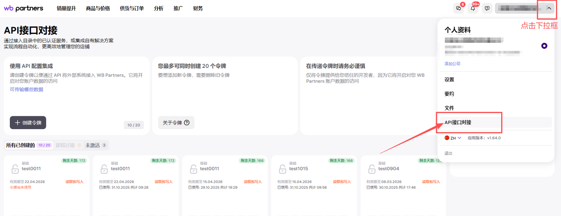 2、登录后,在界面右上角的账户中,点击下拉框小标,再继续点击【API接口对接】进入界面