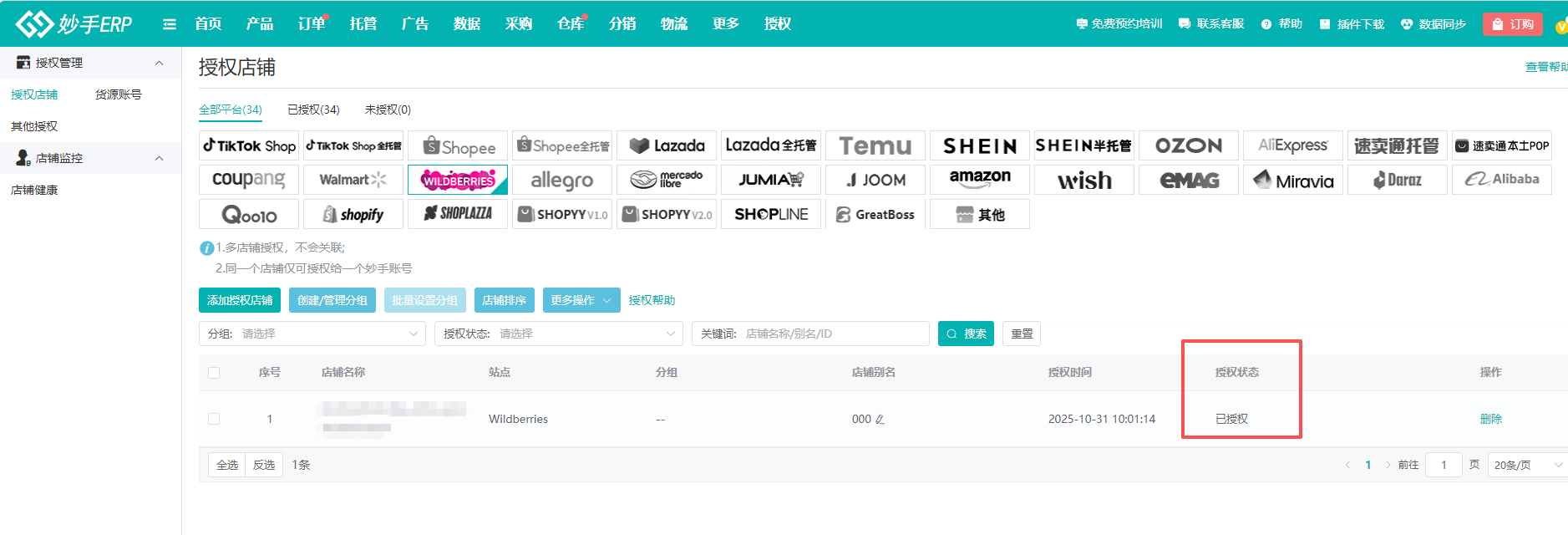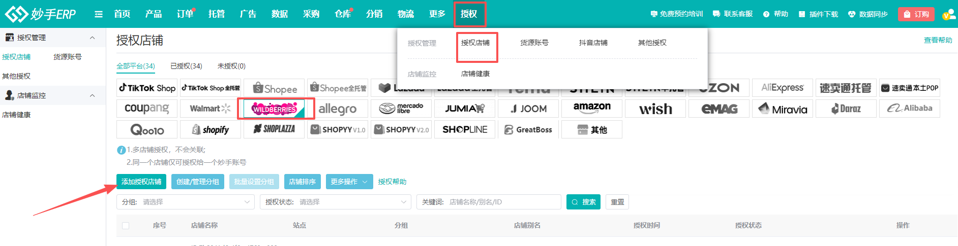 6、打开妙手ERP,进入=>授权=>授权店铺=>选择Wildberries=>点击【添加授权店铺】