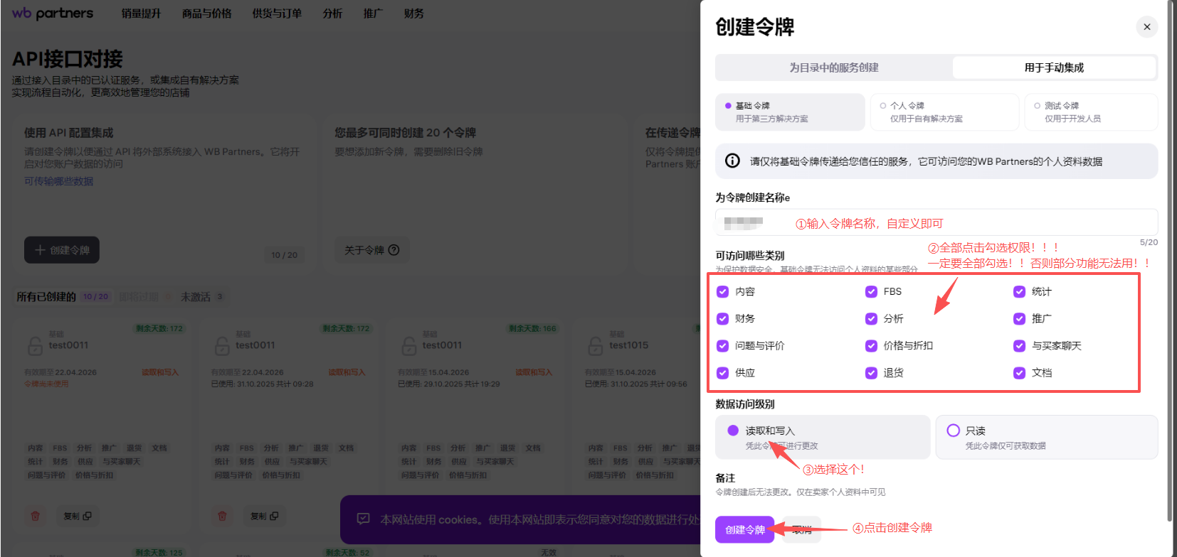 4、按照下图提示完成命名、勾选权限(一定要全选权限!!否则部分功能无法使用!!),