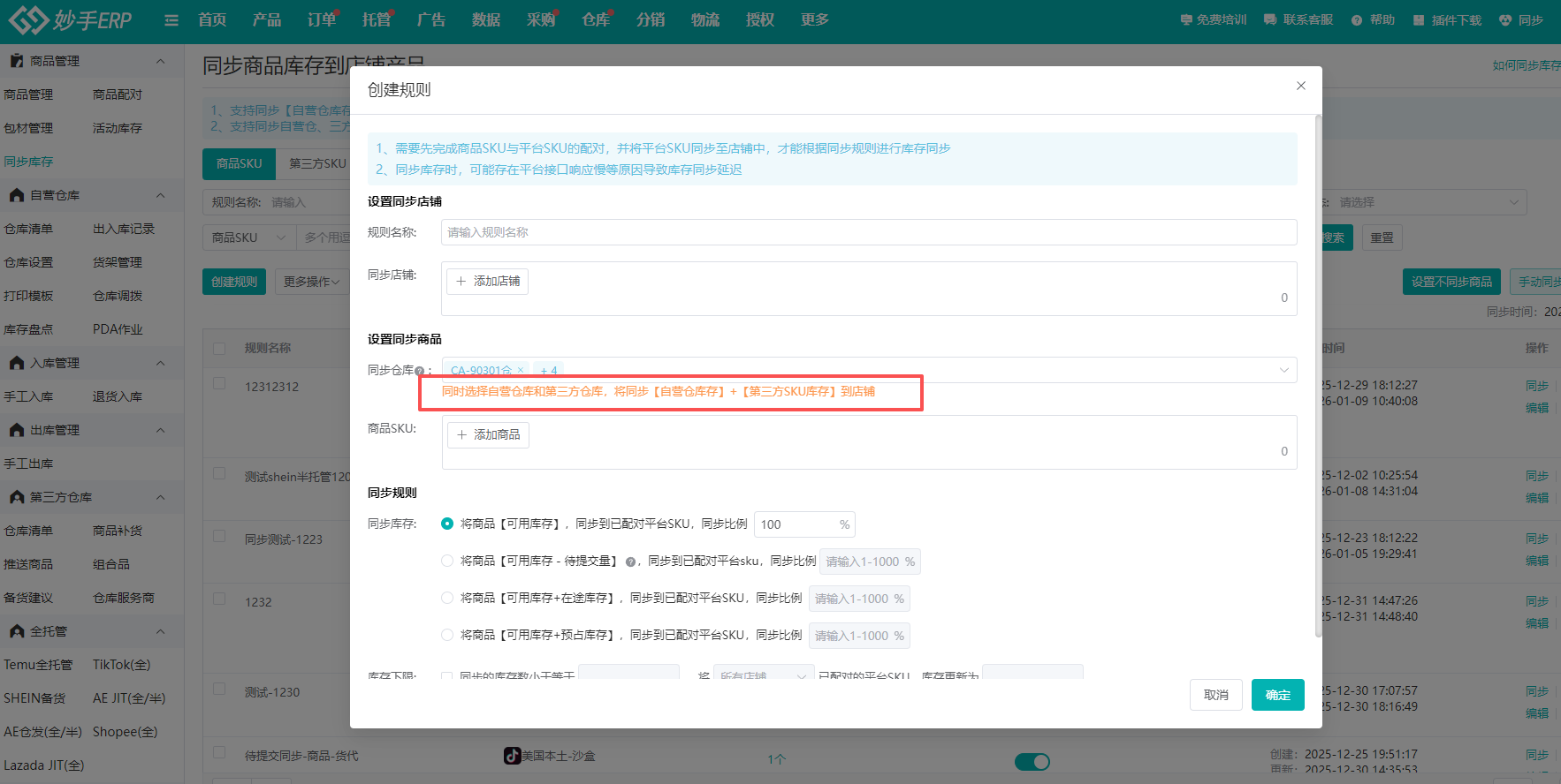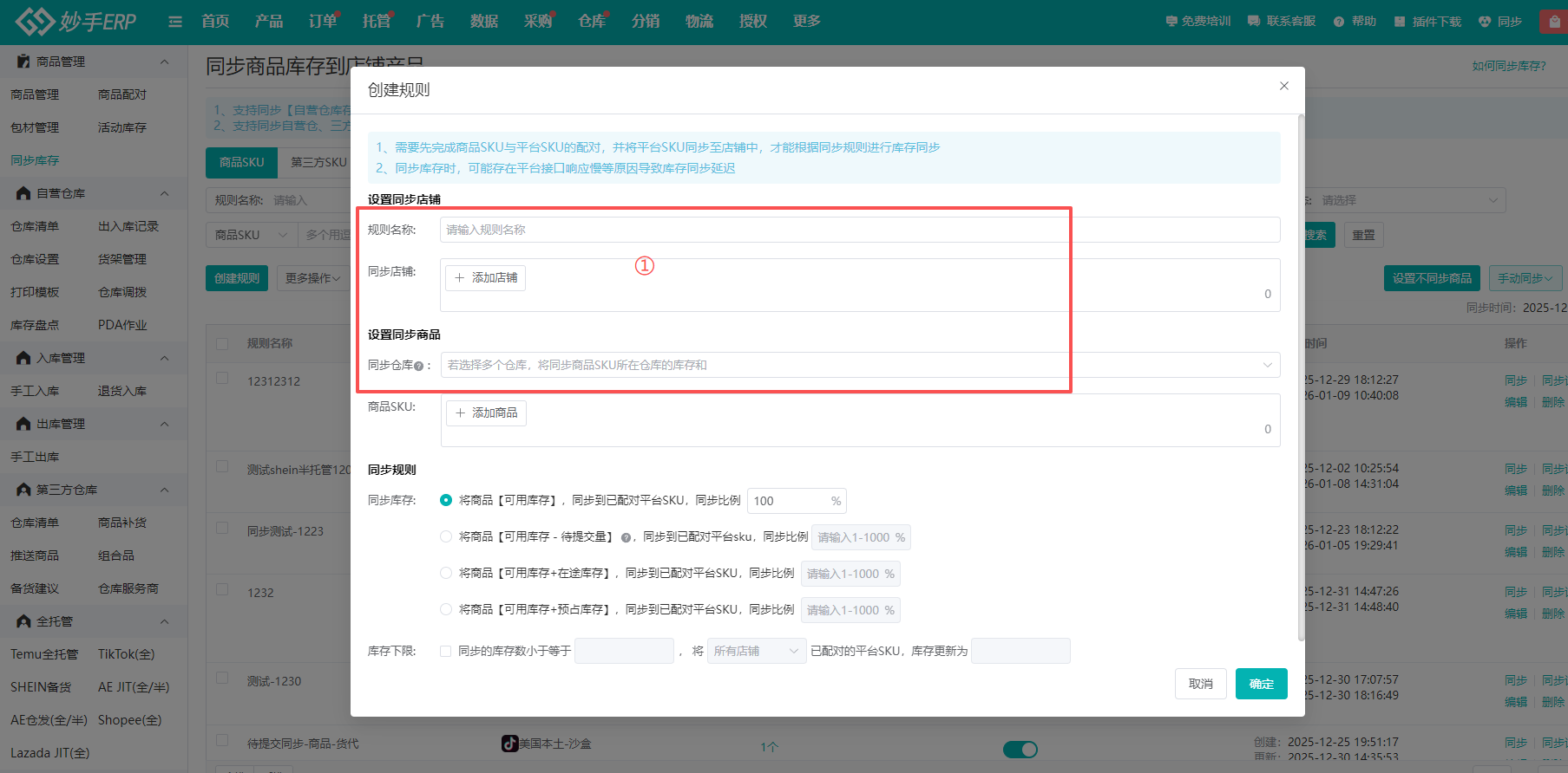①在弹窗中输入规则名称,并选择需要同步的店铺及仓库,