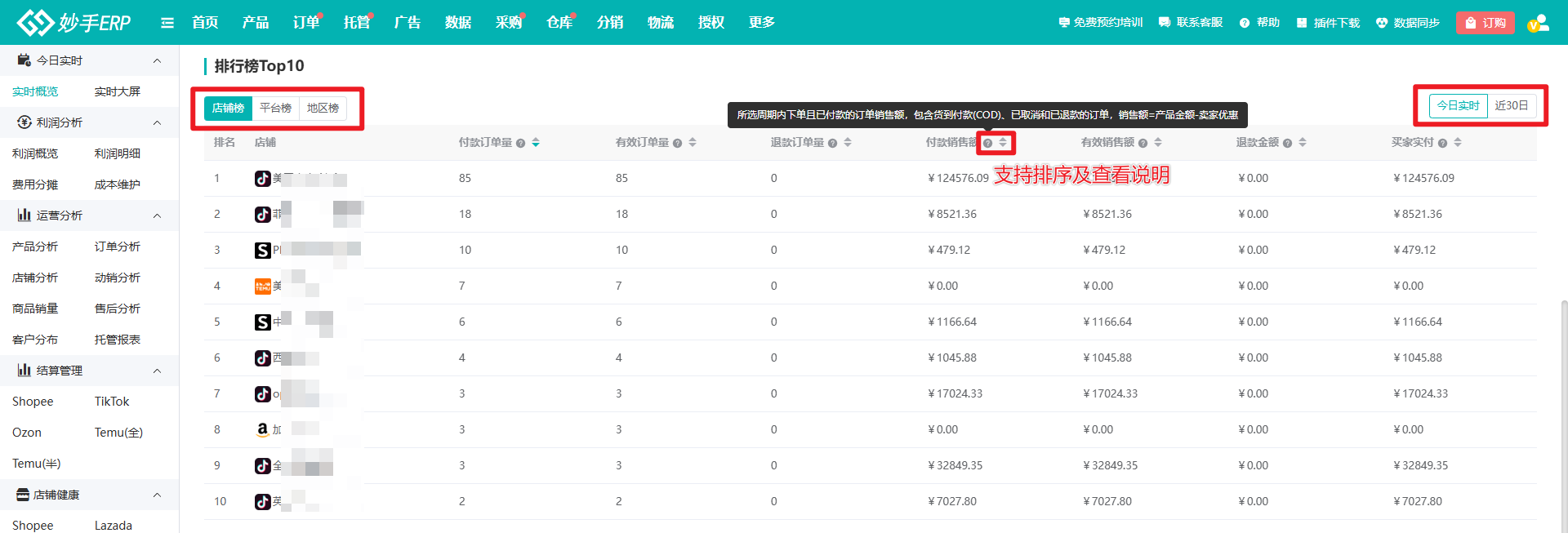店铺榜、平台榜、地区榜都是会显示所选周期内下单且已付款订单量排名前10的店铺、平台、地区,地区指订单收件人地址所属国家或地区