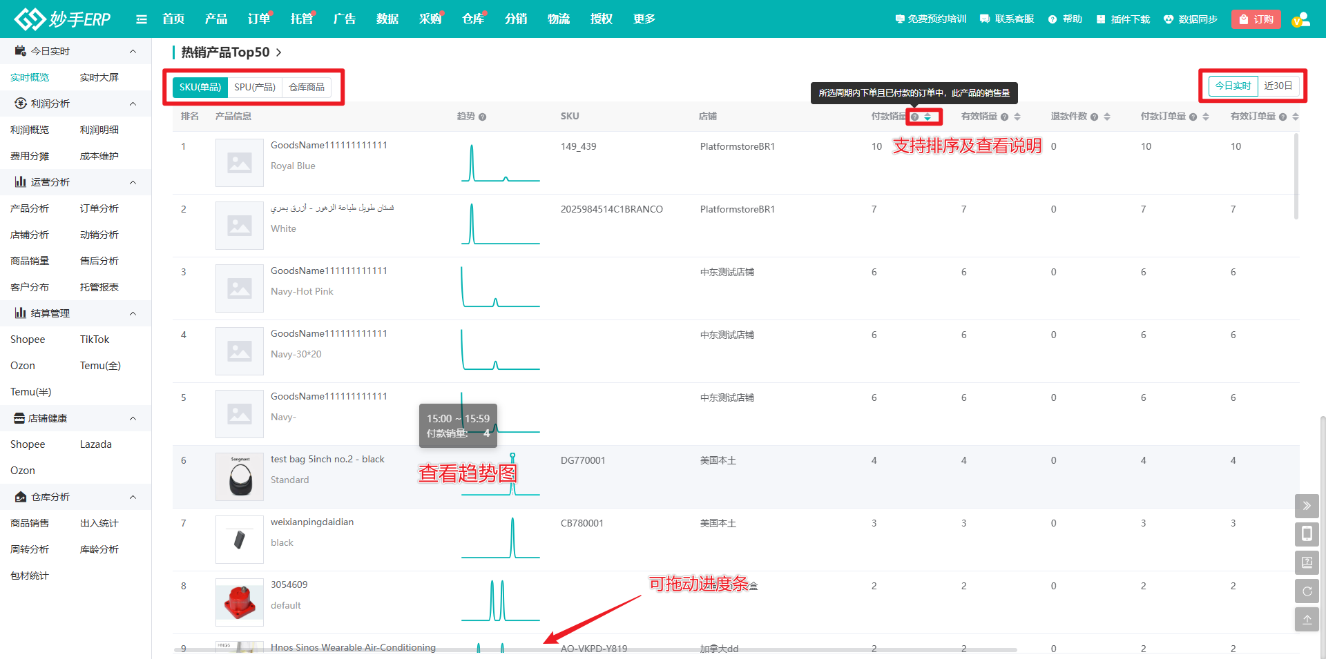 目前支持筛选SKU(单品)、SPU(产品)、仓库商品三种维度,可选择今日实时数据或近30日数据