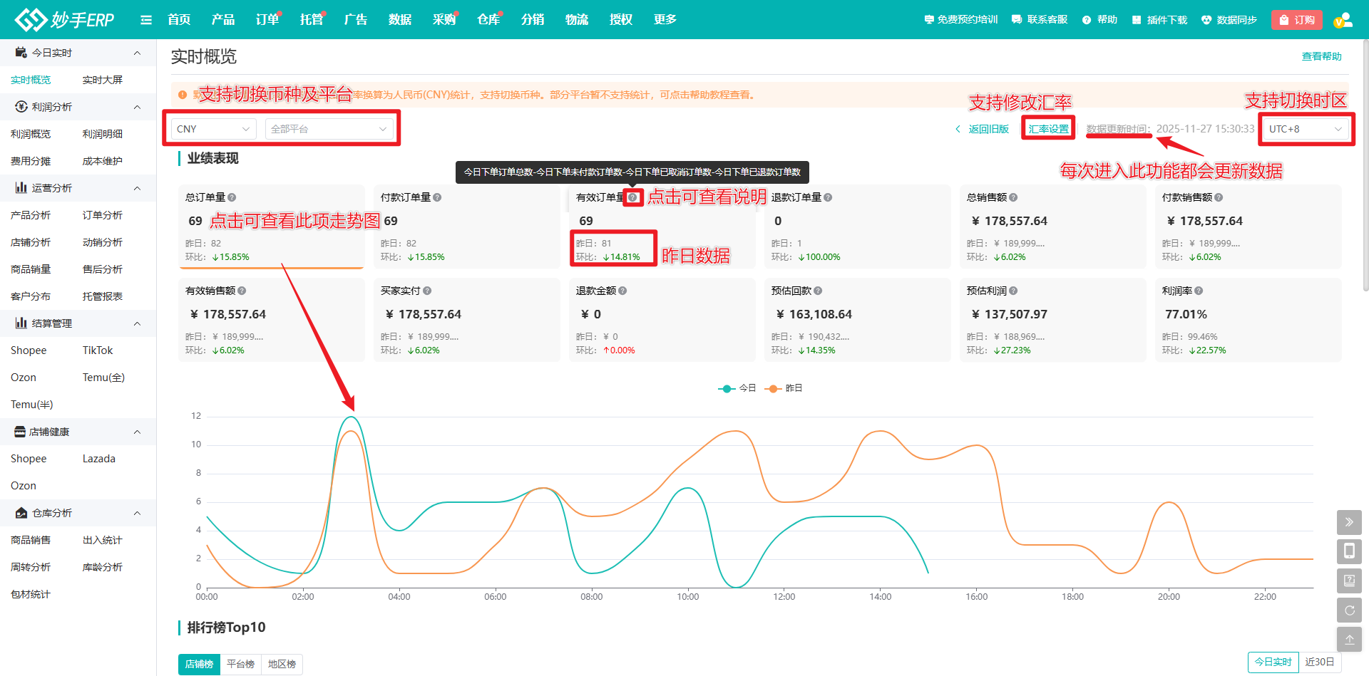 1、此功能是针对授权平台的今日运营数据的实时汇总,从业绩表现,店铺平台排行,产品排行等多维度展示数据;