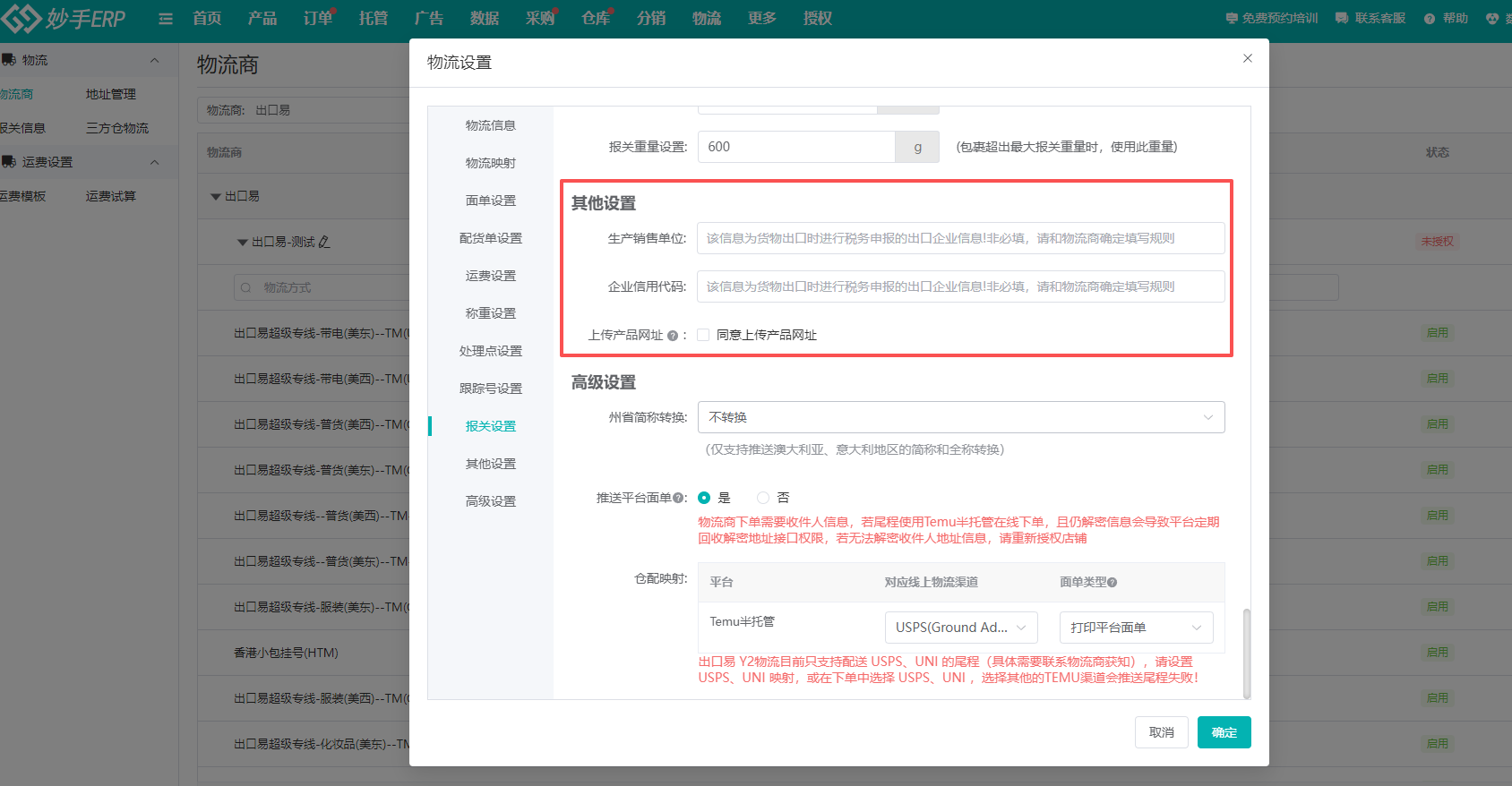 6、授权后回到妙手=>物流商界面,点击三角标识,可打开出口易授权方式,根据实际情况启用物流