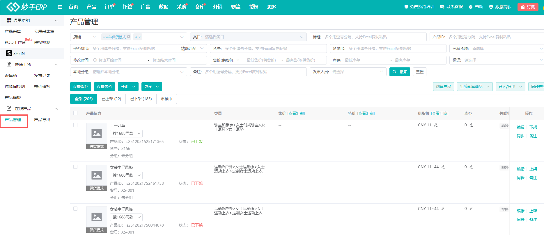 (1)进入妙手ERP,选择产品=>Shein采集箱