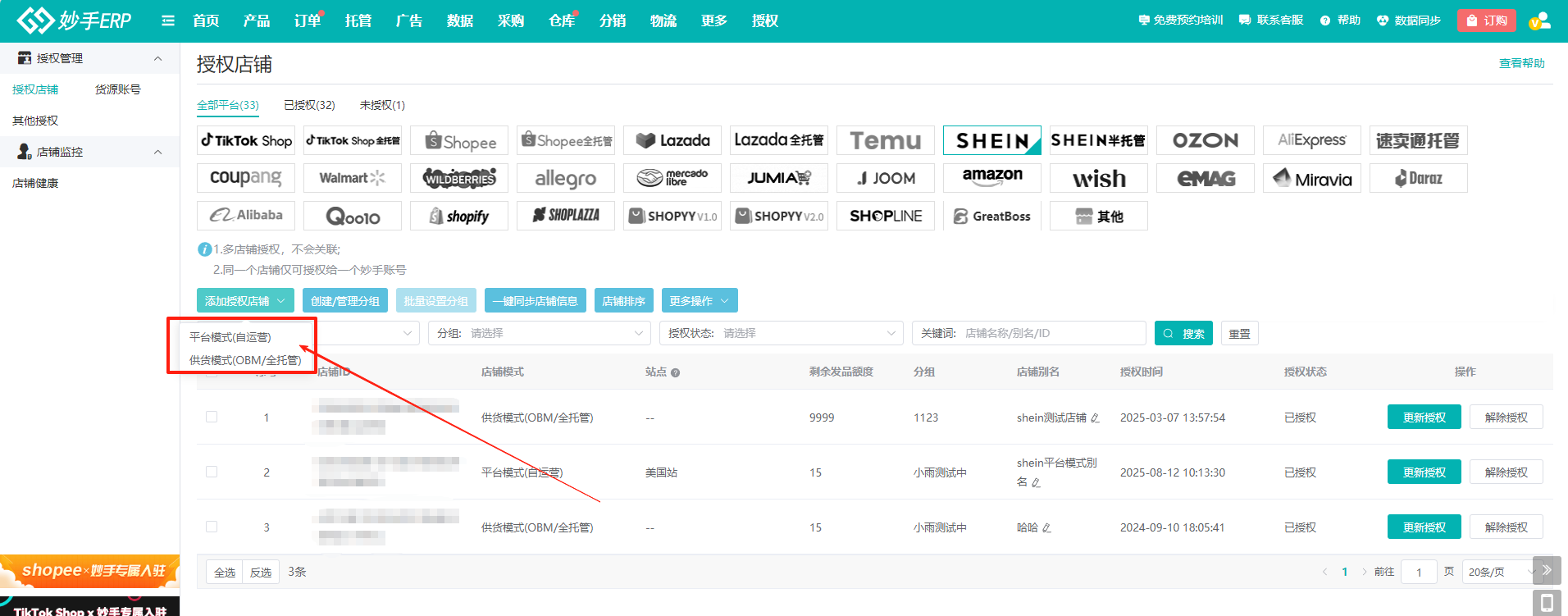 1、本篇教程讲解妙手ERP中授权Shein的平台模式店铺与OBM供货商模式授权流程