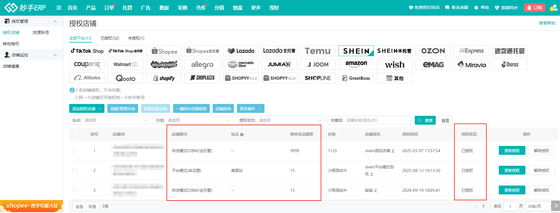 可在店铺授权列表中查看授权店铺的店铺模式、授权站点,以及剩余发品额度(Shein店铺后台也可查看店铺目前剩余发品数);