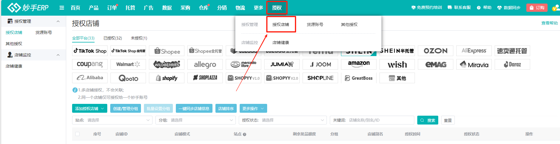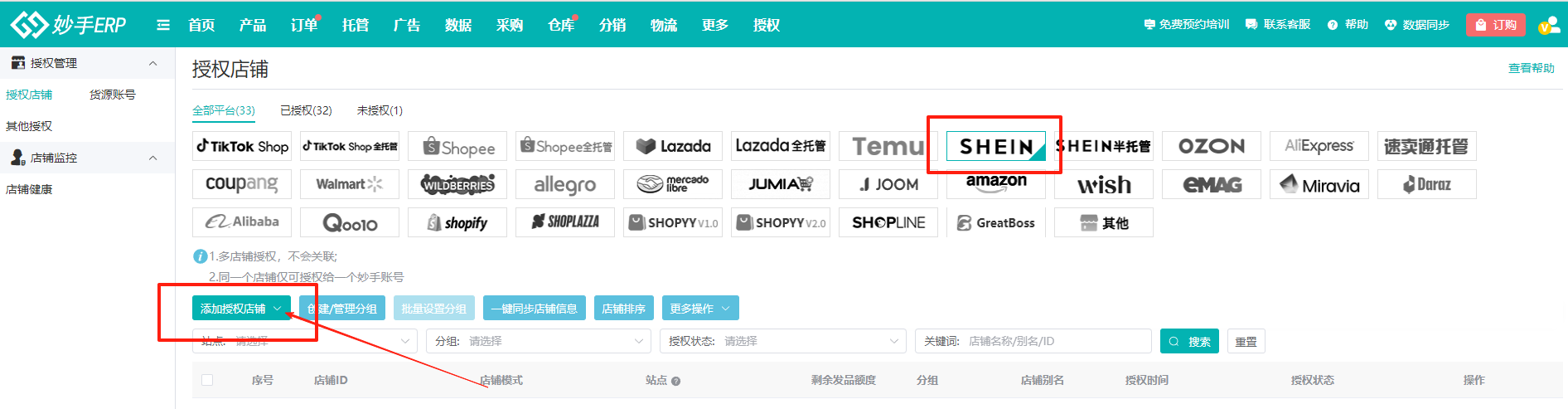 2、进入妙手ERP=>授权=>授权店铺=>SHEIN=>添加授权店铺