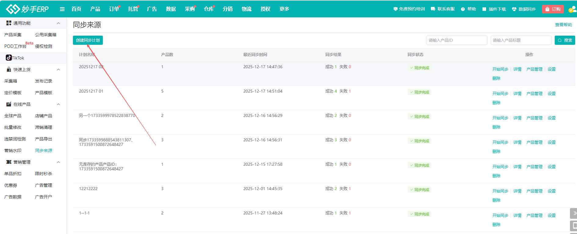 (9)进入到计划列表,可以查看计划的同步状态,显示“同步完成”便可开始进行处理