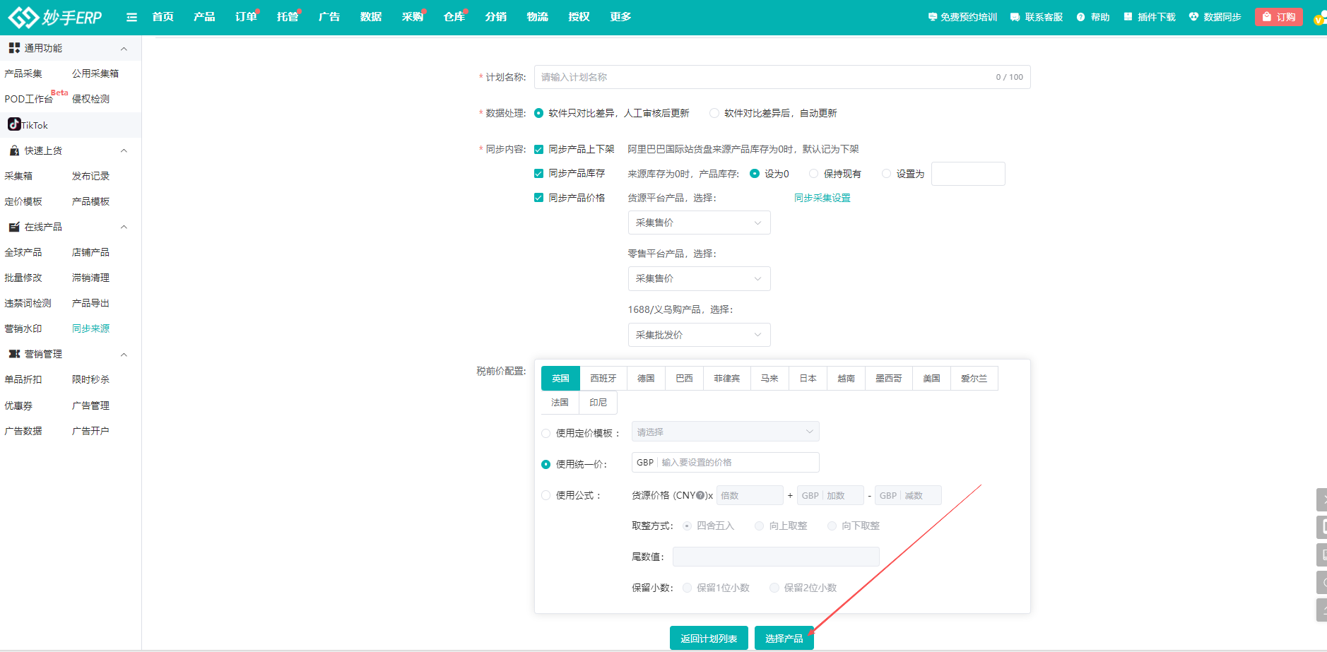 ③同步产品价格:为防止货源产品涨价,导致利润下降,可勾选。且由于货源平台不同,货源平台可选择同步售价/货源价,零售平台可同步售价/批发价,并且可直接通过界面的售价预售配置,设置定价模板/公式/统一价,直接修改在线产品价格