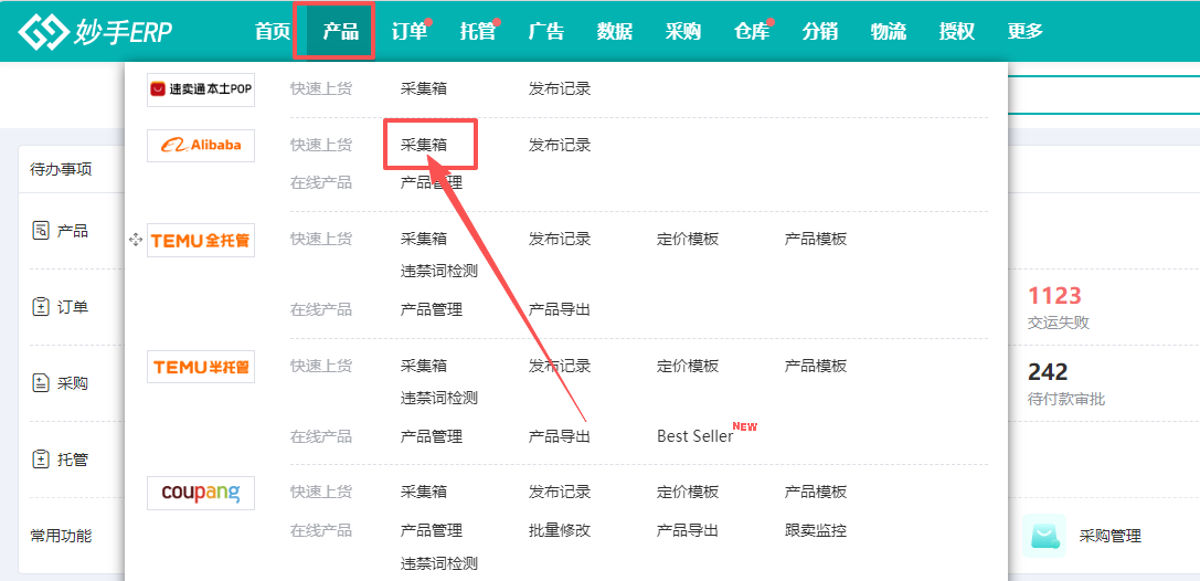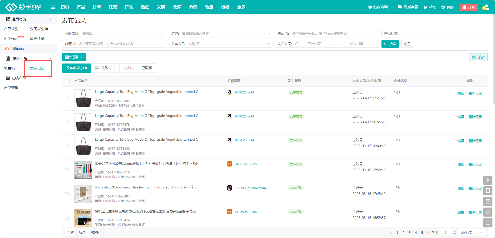 3、Alibaba的产品发布大致流程为:产品采集(采集货源平台的商品到妙手ERP)=>公用采集箱(采集的产品会保存到公用采集箱,可大致编辑产品信息,并认领到平台采集箱)=>在平台采集箱中,根据平台,将产品信息修改完整后,再发布到店铺,即可完成发布流程=>最后到发布记录中查看产品是否发布成功