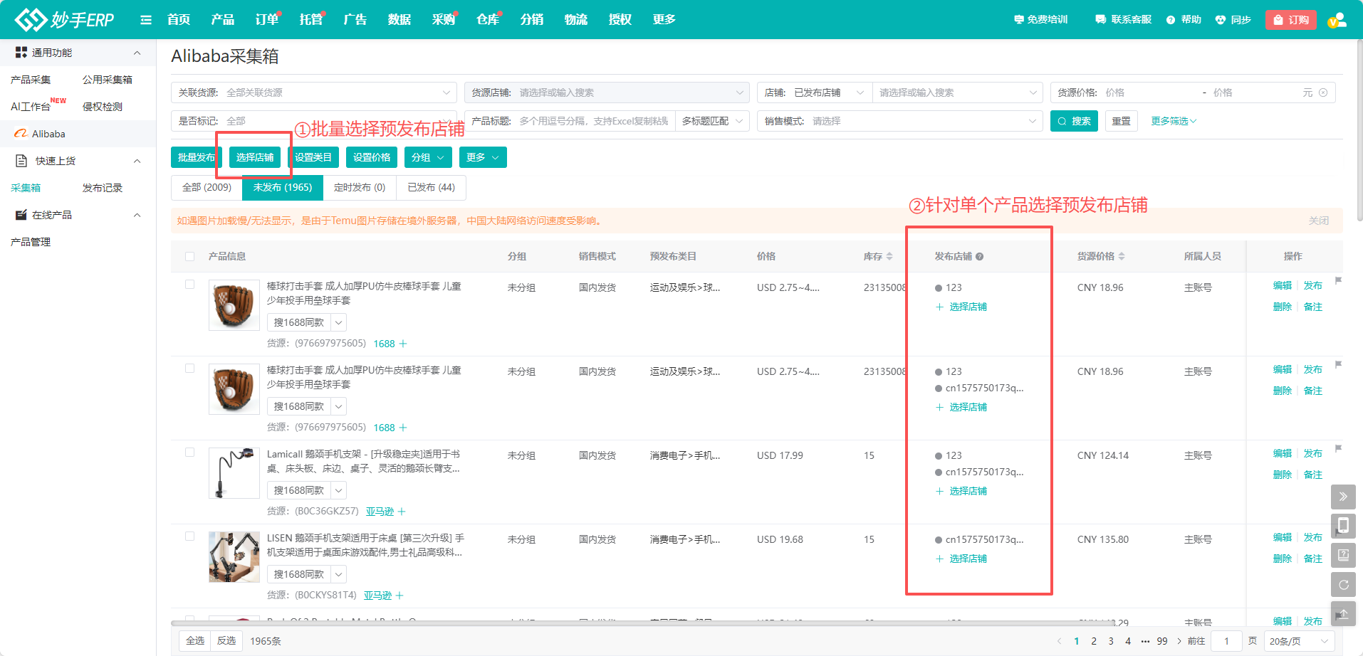 (2)进入采集箱后,需要先选择预发布店铺,支持批量选择/单产品选择