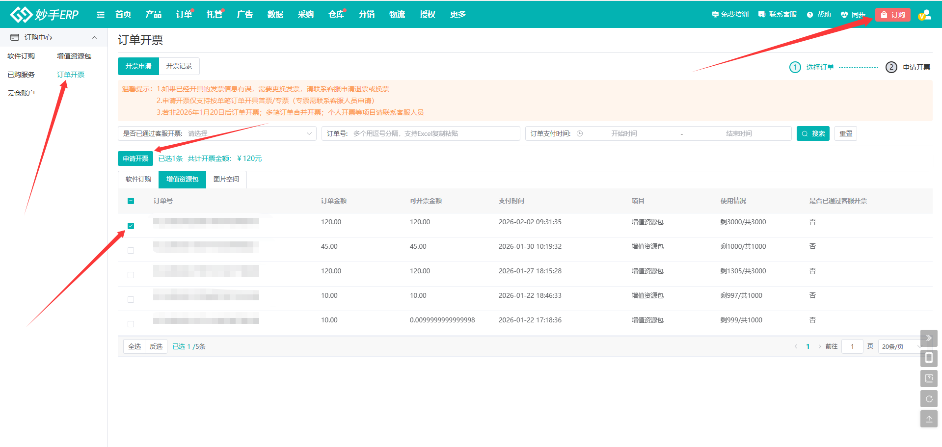 可以在妙手ERP内自助申请,右上角订购-订单开票,选择需要开票的订单-点击申请开票-填写开票信息-提交审核,发票开出后会发送到填写的邮箱内。