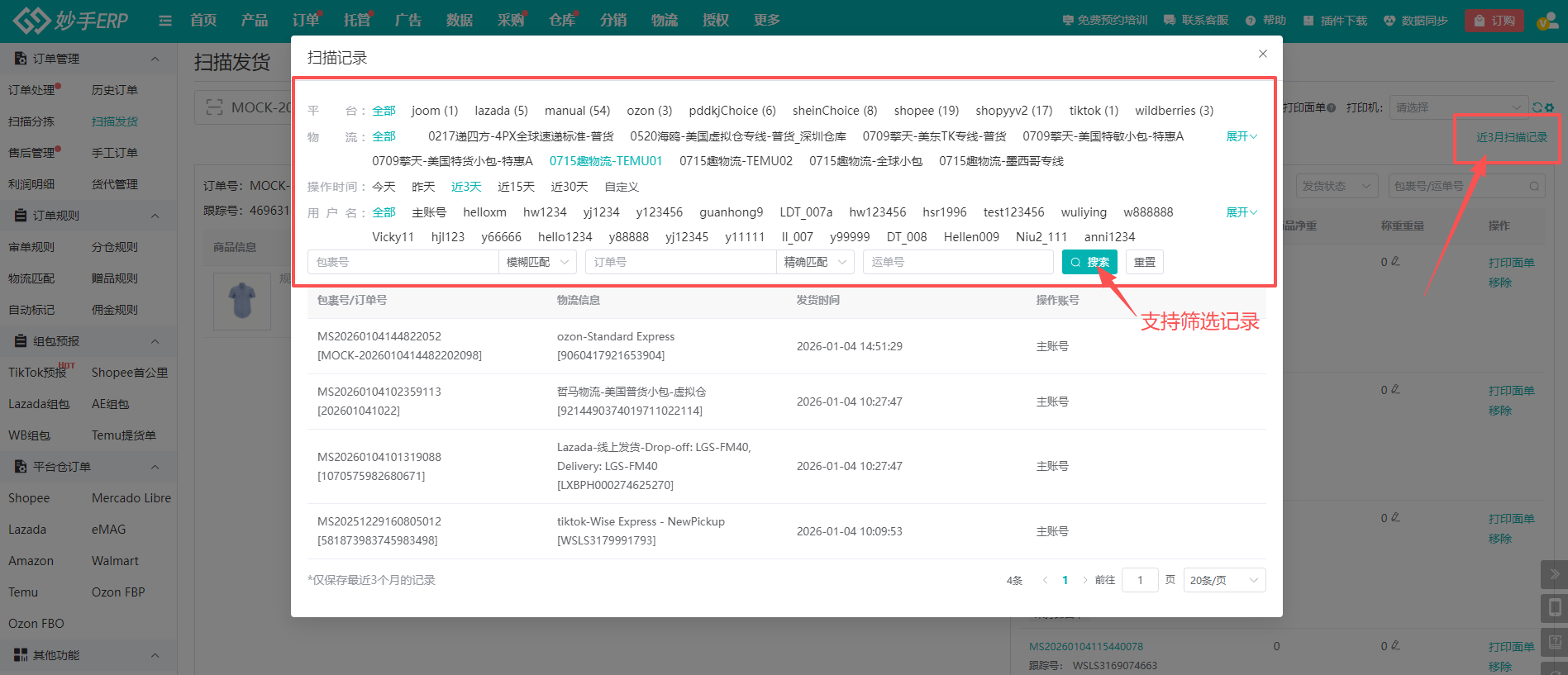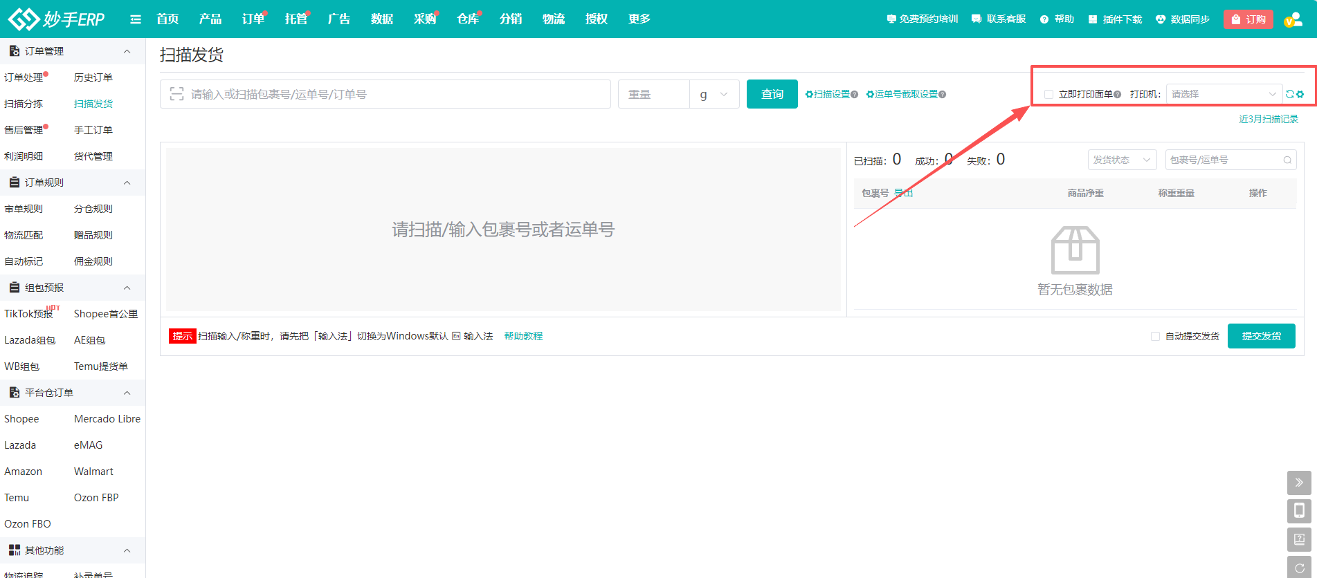 1、使用扫描发货功能时,操作人员可直接使用扫描枪快速识别TikTok、Shopee、Lazada、OZON等多平台包裹面单上的条码信息。系统将自动匹配并调出对应的订单详情,包括商品清单、数量及收货信息等。工作人员可现场核对实物包裹与订单商品是否一致,校验无误后,无需切换界面,即可一键提交发货,极大提升多平台订单处理效率,并有效避免发错货、漏发货等情况。