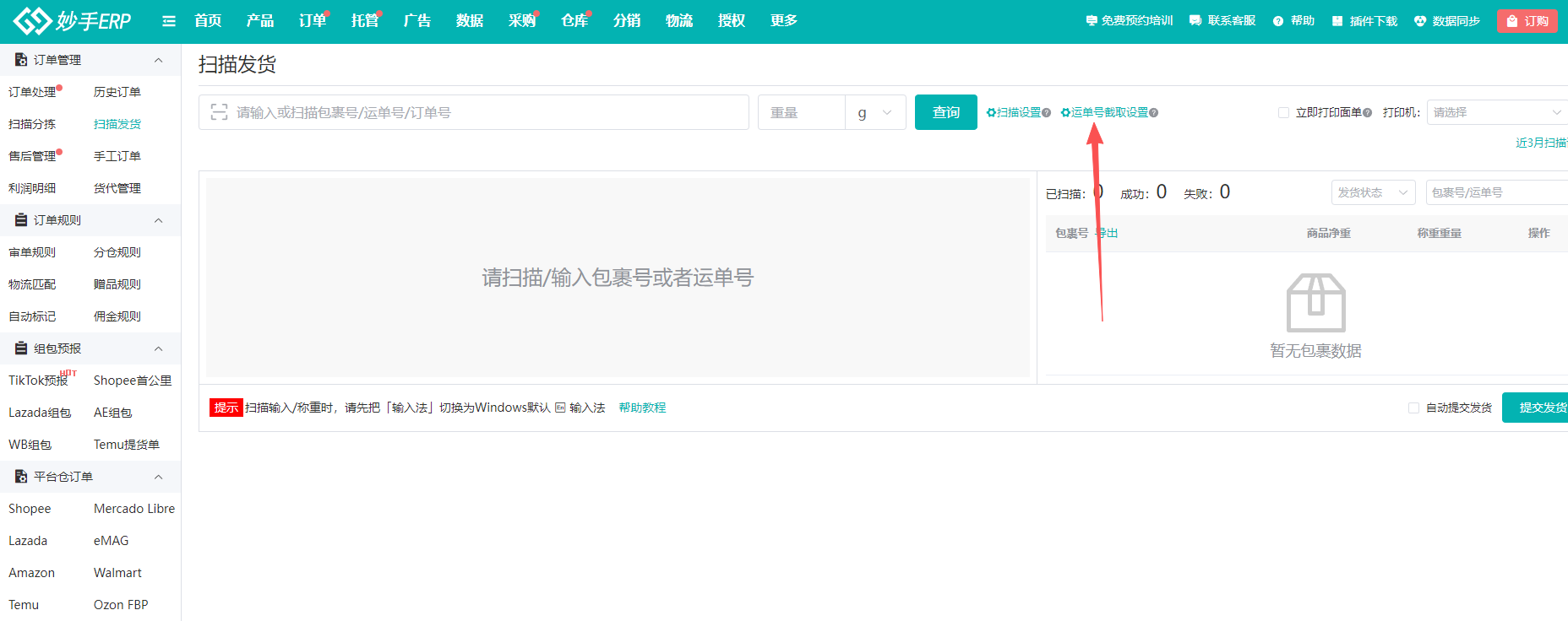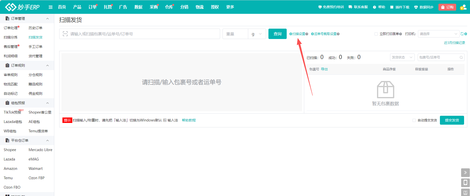 如未开启自动发货,需要在完成包裹检验后自己提交发货;如开启自动发货,需要设置扫描次数