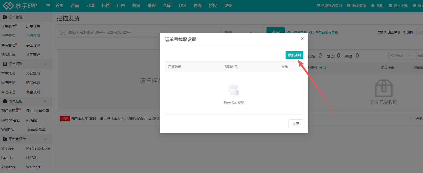 部分物流商有自己的自定义单号,扫描时系统无法识别此单号,需要截断部分长度数字。可在弹窗中设置截取规则