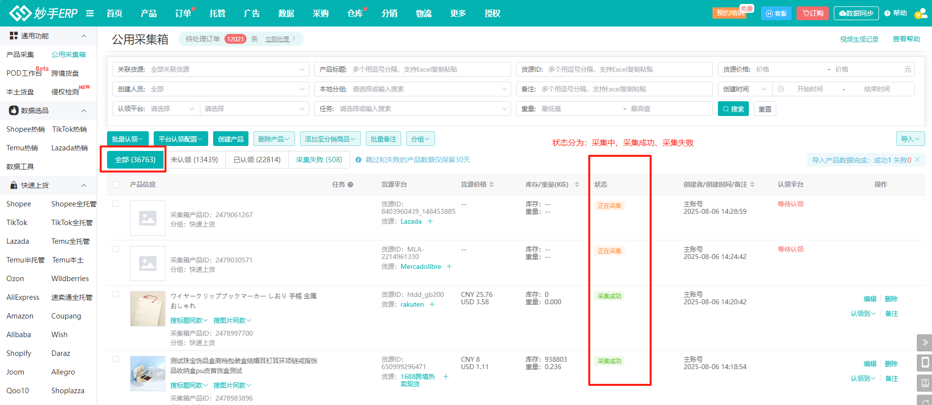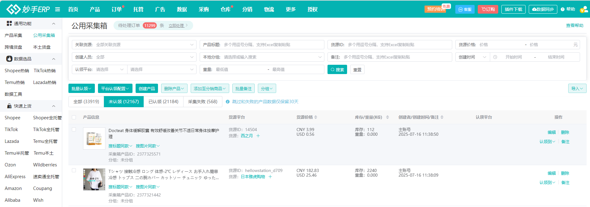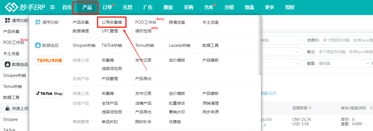 2、在妙手ERP中,有公用采集箱和平台采集箱;