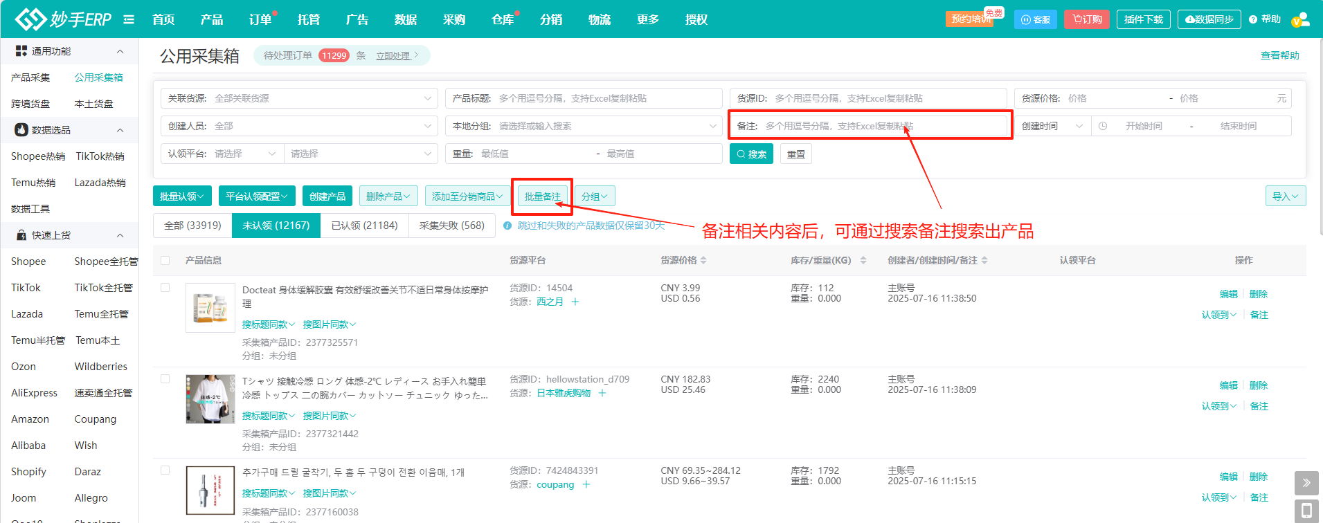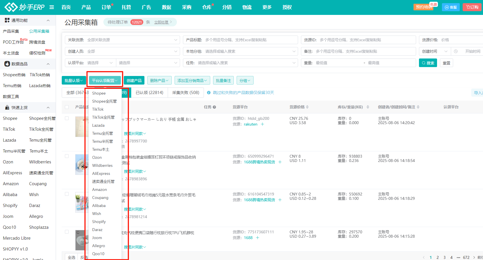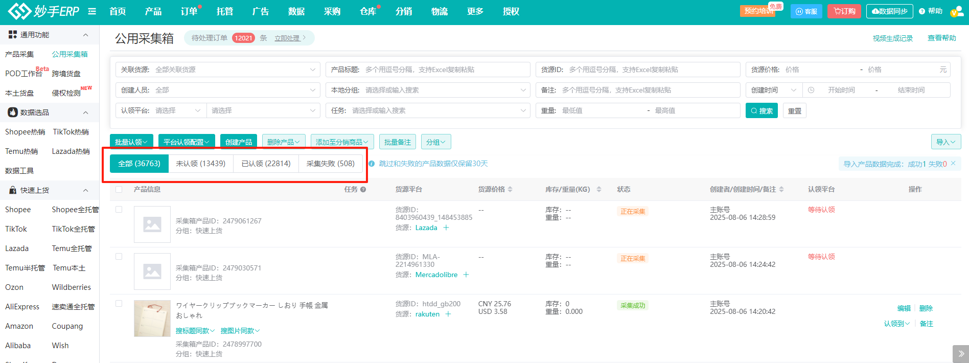 2、在妙手ERP中,有公用采集箱和平台采集箱;